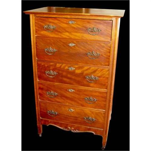 <table width="100%" border="0" cellspacing="0" cellpadding="4"><tr><td><em> </em></td></tr><tr> <td width="100%"> 19th century Victorian flame cherry veneer over birch chest of drawers with original lock and key hardware and pulls raised on wooden caster legs, this dresser measures 49 inches tall, 30 inches wide and 19.5 inches deep, has normal wear, with a slight age split running several inches across the top left of the dresser, otherwise in excellent condition and would make a wonderful addition to any fine household or collection.