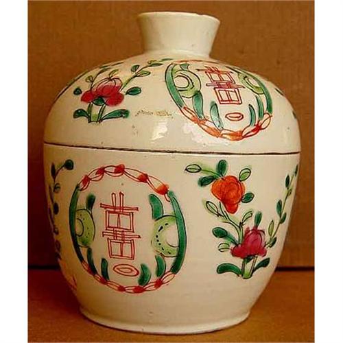 19th century Chinese export semi egg-form porcelain vase or cache pot, finely hand painted in rare famille-verte Rose (Pink) red, yellow, green, celadon, orange, and gold. The lid depicts flowers in full blossom. The main scene is a continuation of the lid, and again depicts floral motifs throughout. The vase is signed on the lid, and underside with a Red-orange Chinese export mark. (Green mark on bottom)The peony flower is believed to symbolize youth; butterflies represent the spirits of divine lovers and long life. This piece would make a wonderful addition to any fine Chinese export collection. ****NOTE: Email for larger images.