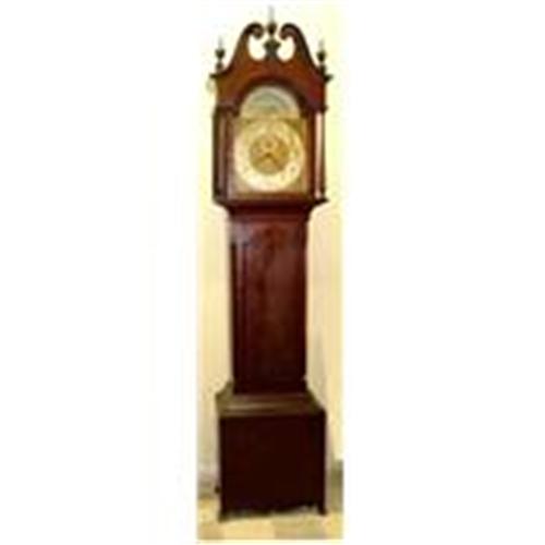 19th century Chippendale Tall Case Grandfather Clock in a mahogany case, with a rich reddish brown patina, with a broken pediment scrolling triple spire finial bonnet, 29 1/2 day moon phase, lavish hand engraved dial with applied gold tone Arabic numeral hour designations, crescent moon hand subsidiary seconds, with John Ross open work hands [In Quest of Clocks by Kenneth Ullyett Rockliff Publishing Corporation LTD Copyright 1950], two train weight driven 15 day movement, robust chime on the half hour and on the hour, hammer and crown trademark emblem engraved into the movement.