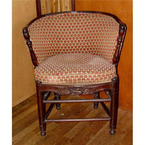 19th century mahogany upholstered Continental Rococo style round back armchair with a rush-wicker seat joined with wooden peg joining instead of metal nails (see arrow in last image). This rare and unseal armchair has its original opulent reddish-brown patina finish, is very sturdy and quite comfortable and would make a splendid addition to any fine household or collection. ****NOTE: Email for larger images.