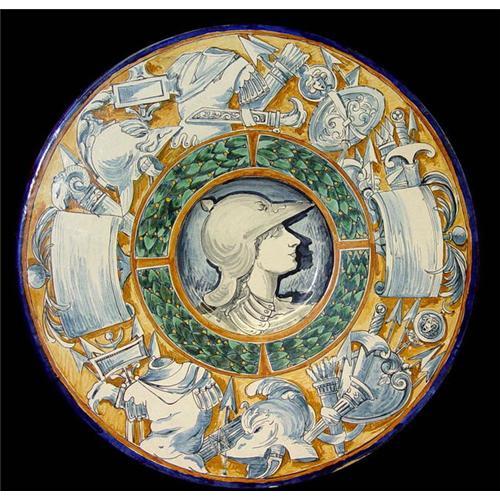Massive hand painted,19th century Deft porcelain Greco-Roman warrior charge wall plaque, with a cobalt blue circumscribing rim, battle regalia and weapons of the era in the surround on an amber-orange ground centered with a rich contrasting green acanthus leaf chapter ring depicting a side profile of warrior proudly wearing his helmet. This charger is in excellent condition, with normal wear, no major or minor cracks, damages, repairs or restorations. It is in rare and unusually excellent condition and would make a super addition to any fine household or collection. ****NOTE: Email for larger images.