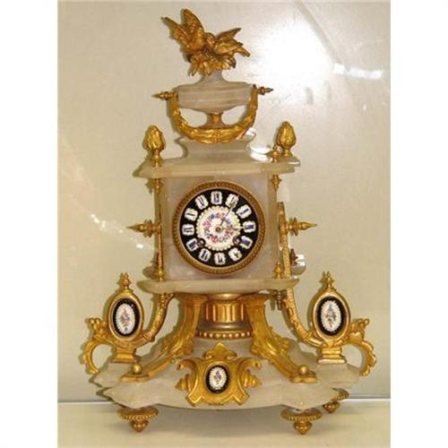<tr><td>Title: 19c Dore Bronze Onyx French Mantle Clock Birds</td></tr>