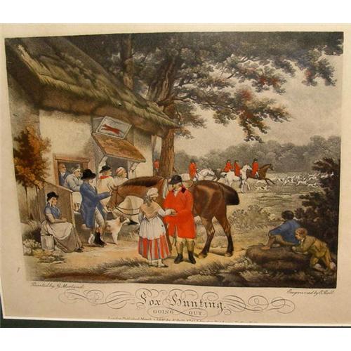 Set of four 19th century English fox hunt engraving by E. Bell, hand painted by G. Morland, each titled Fox Hunting; Going Out, The Check, Going Into Cover, The Death, London Published April 14, 1800 by E. Bell No.45 Islington Road near Sadlers Wells.