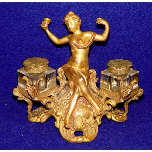 19th century French Art Nouveau gilt bronze and crystal desk top ink well, with a high relief gilt bronze semi nude reclining female celebrating life with wine goblet in hand, she sits atop an ornate acanthus leaf adorned stand flanked on both sides by matching cube form crystal wells with their corresponding lids, measuring 4 7/8 inches / 12.3 cm height, 6 1/2 inches /16.5cm width, 4 3/4 inches /12 cm depth. The wells measuring 35 X 35 X 42 mm. Condition: some wear to the gilt, overall good condition (see images). ****NOTE: Note email for image to view the back.