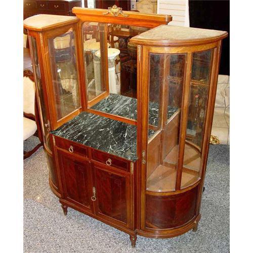Outstanding 19th century French Mahogany and Marquetry inlay double side by side with bronze mounts, beveled glass mirror above a verdi-marble secretary of drawer space flanked on both sides by a pair of pie wedge shaped mirror backed and tri-level bent glass curios type display compartments with 2 slices of pie shaped glass in each, original bronze hardware and key. <P>This rare and unusual piece is missing its verdi-marble top as it was broken by the consignor when they brought the piece to our gallery. The consignor is willing absorb the cost of a custom fitted piece of marble of any color of your choosing. This side by side would provide an amazing degree of curio display surface and serve as a secretary vanity as well and would make a great addition to any fine household. <P>****NOTE: Email for larger images.