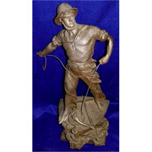 Outstanding 19th century French spelter mariner standing atop ships bow beside a colossal anchor preparing to cast the realistic twisted rope line, in high relief with splendid movement in the round, original patina in very good condition, titled "Secours" on the front which translated to "help" (perhaps rescuing a sinking ship or an overboard comrade), signed Waagen Sept on the cut-away back of the ship, measures an impressive 27 1/2 inches (70cm) in height. The artist WAAGEN, Arthur (b.1869) is listed and this piece would make a spectacular addition to any fine household or collection.