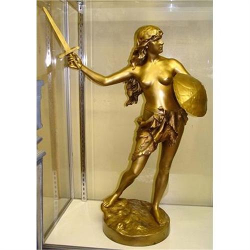 Signed J. Garnier on the base, 19th century French gilt spelter scantly clad sword and Tortuous Shell shield wilding female figural warrior statue which would make a splendid gift or addition to any fine household or collection.