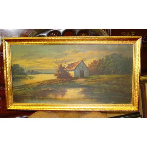 <tr><td>Title:19c Landscape Oil Painting Cottage Cabin Lake</td></tr>