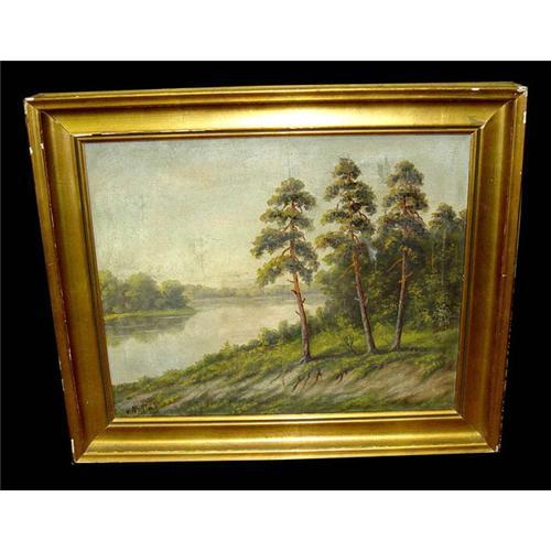 19c Woods Forest Lake Side Oil Painting signed J. Nottliuk lower left, in a period gilt wood SIZE: 16 x 20 inches (artwork), 20 x 24 inches (frame). CONDITION: Several old repairs to the canvas, otherwise good. REF# OIL_319