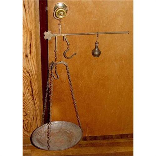 Hand hammered nickel plated copper bowl, marked and dated 1851, hangs suspended by 3 chains attached to the left side of the sliding scale delineated bronze rod, on which is attached 2 hooks from which to suspend the scale an a bronze and cast iron sliding weight with a lead core. When an equivalent amount of force causes the sliding weight to balance the object in the scale, the user can count off the amount of lines the weight crossed on the rod to have an accurate estimate as to how much the object weighs. This unusual and antique scale would make a fantastic addition to any fine collection. ****NOTE: Email for larger images.