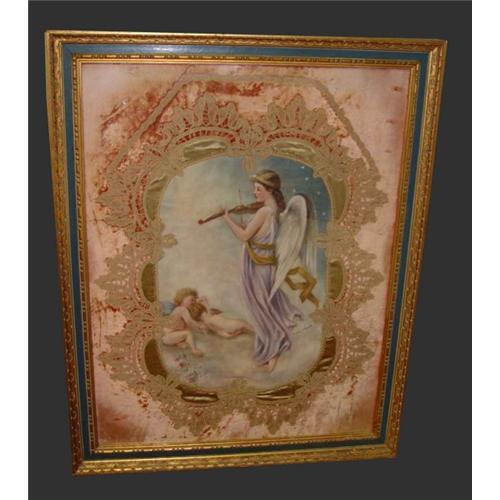 A superb 19th Century Victorian era oil painting signed L. A. Van Wagner. lower middle right depicting a somber angle playing the violin lulling the pair of younger angles to sleep, red roses strewn at their feet, bordered in a lavish gold red and pink velvet background adorned with impressive detailed embroidery work. Size: 44 1/4 inches x 35 inches. Condition: minor fading to some of the velvet, overall very good condition.