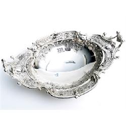 19c continental silver (tested) fruit basket, the body chased and embossed with vines and recco scrolls, 13" long on 4 shaped feet