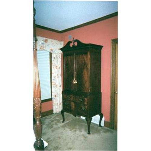 This piece has it's original finish and hardware. It has been damaged slightly on left side, but it looks as though the spot has been professionally restored. And one of the top wings next to the finial has been repaired (this is not noticeable.)