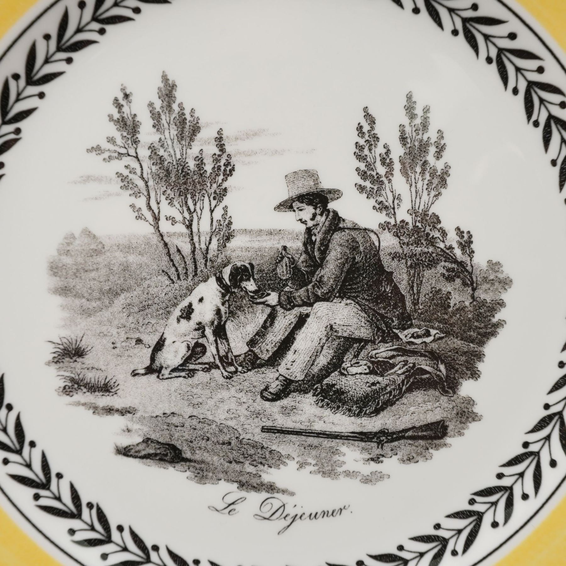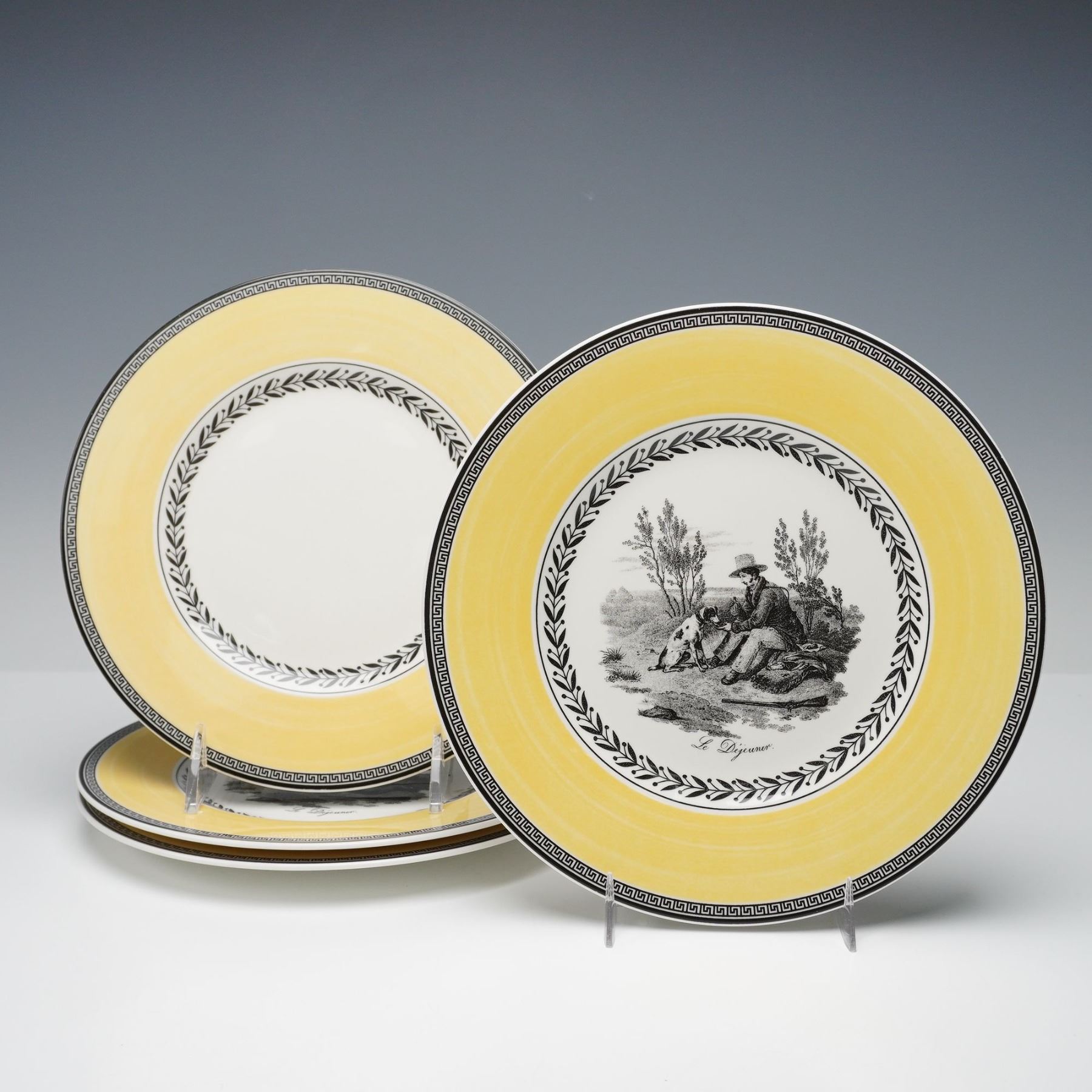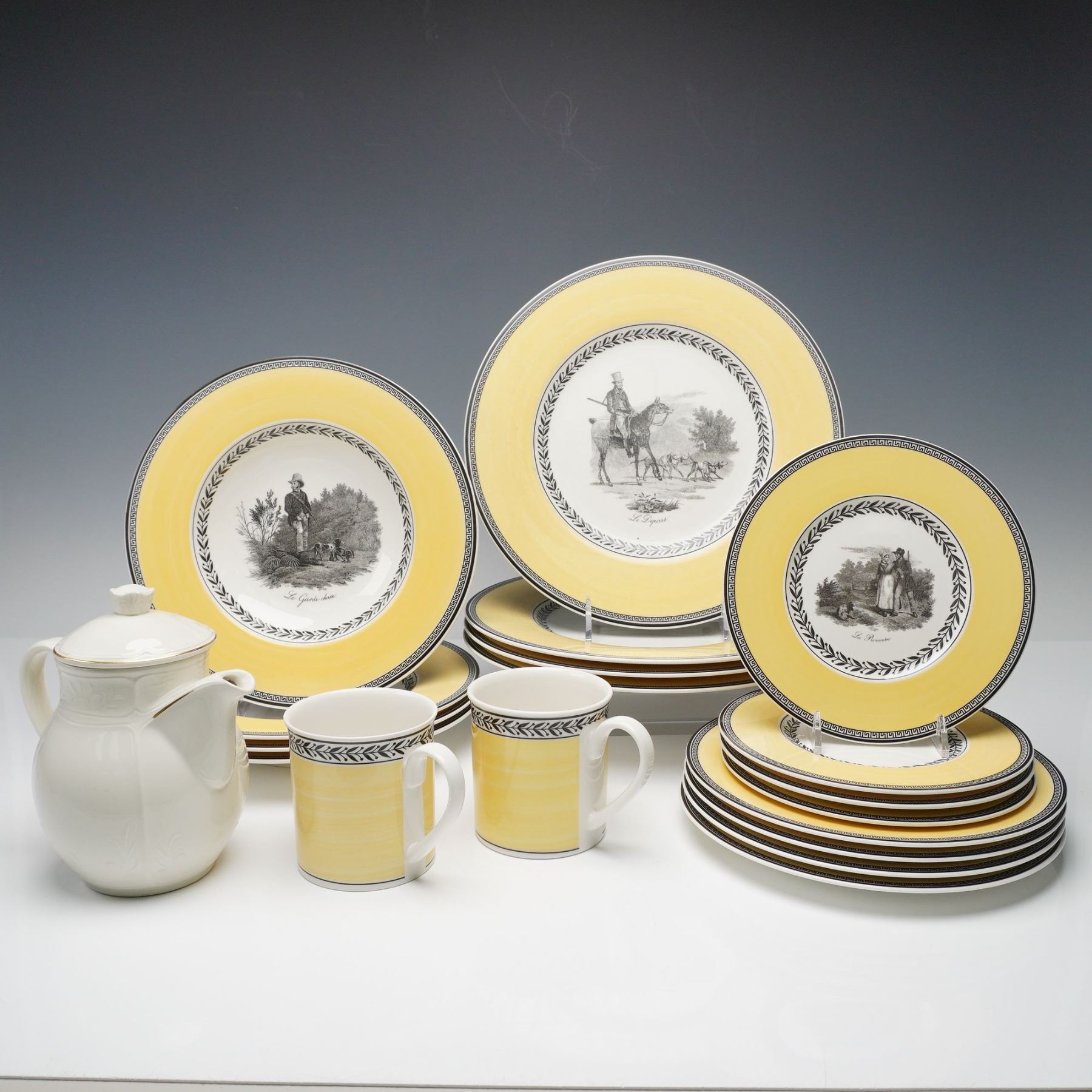 Charming 19-piece mixed dinnerware set by Villeroy & Boch, made in Germany and crafted of fine premium porcelain. The set includes four each of dinner plates, salad plates, bread plates, saucers, two mugs, and one Cortina pattern teapot. The Audun Chasse pattern showcases pastoral hunting scenes, such as Le Dejeuner and La Chasse, rendered in black-and-white toile-style vignettes framed by laurel borders and warm yellow bands. Complemented by pieces from the coordinating Audun Fleur series, this collection blends rustic French countryside imagery with refined European design. Each piece bears the Villeroy & Boch 1748 - Audun Chasse backstamp, signifying quality and tradition.