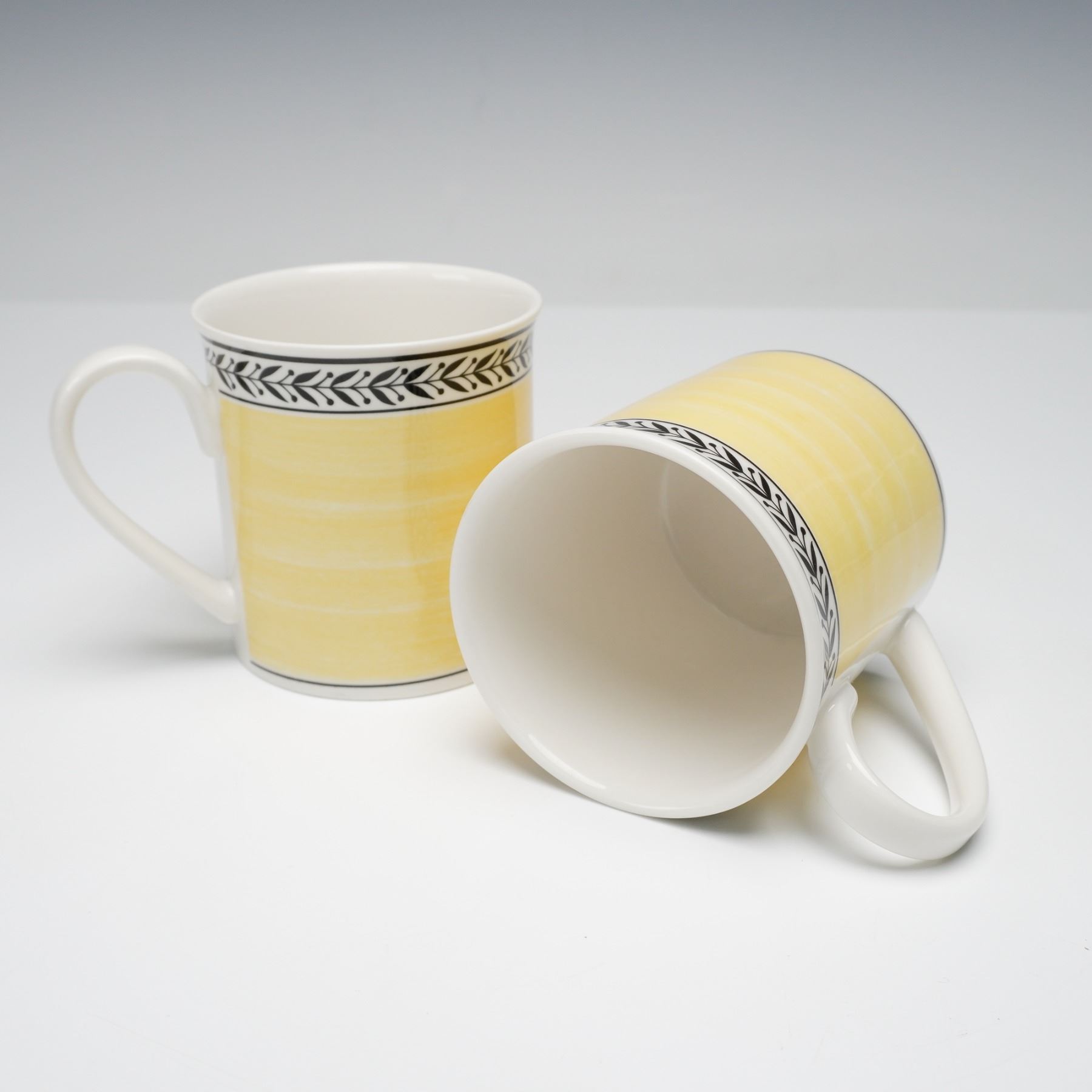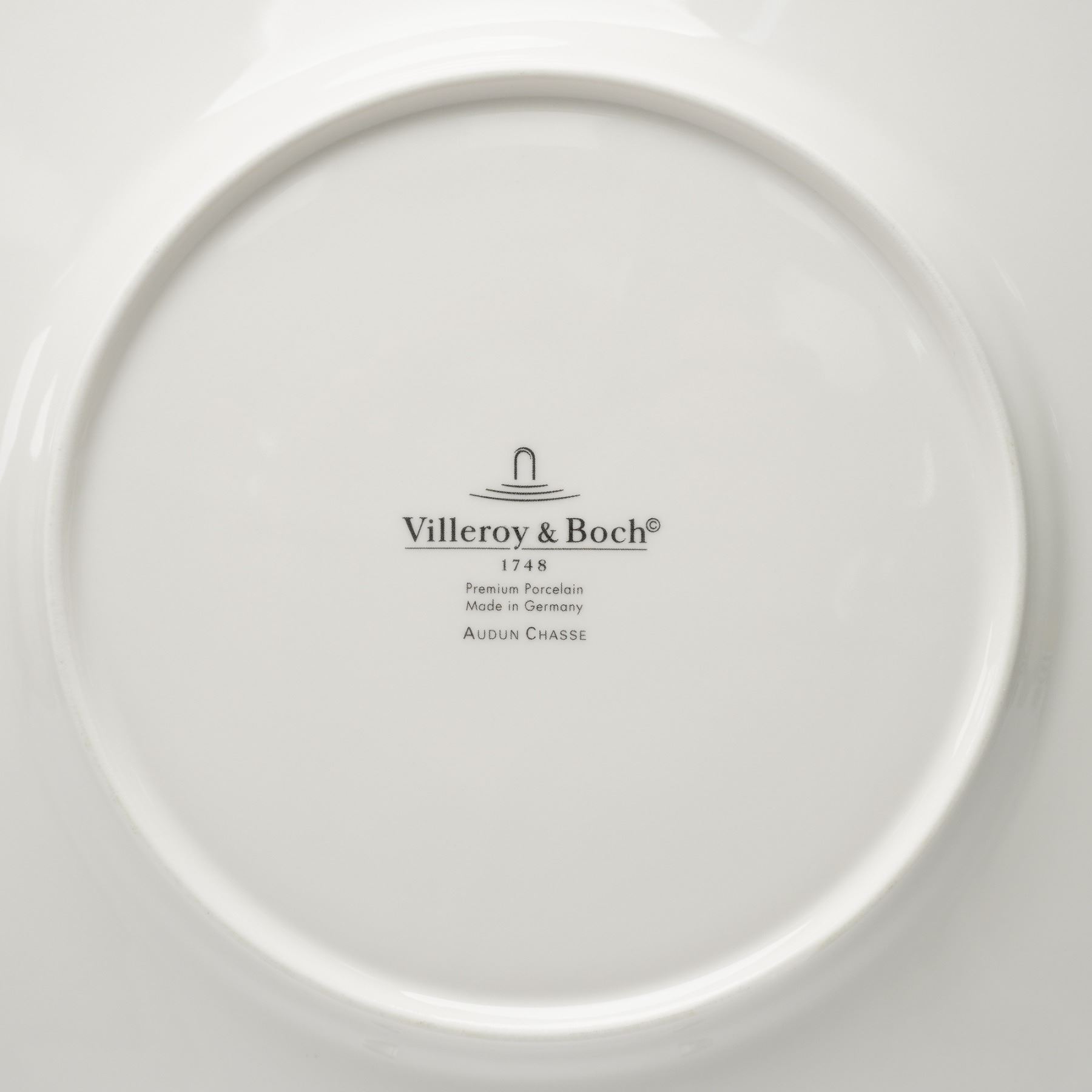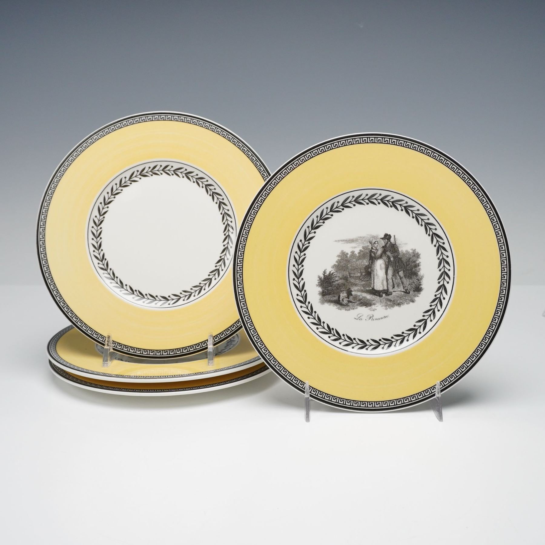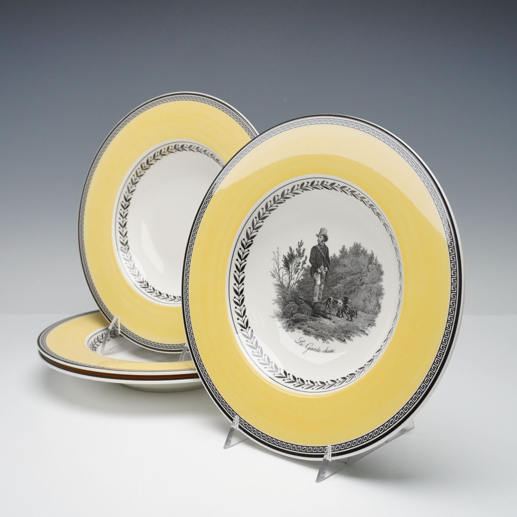 Charming 19-piece mixed dinnerware set by Villeroy & Boch, made in Germany and crafted of fine premium porcelain. The set includes four each of dinner plates, salad plates, bread plates, saucers, two mugs, and one Cortina pattern teapot. The Audun Chasse pattern showcases pastoral hunting scenes, such as Le Dejeuner and La Chasse, rendered in black-and-white toile-style vignettes framed by laurel borders and warm yellow bands. Complemented by pieces from the coordinating Audun Fleur series, this collection blends rustic French countryside imagery with refined European design. Each piece bears the Villeroy & Boch 1748 - Audun Chasse backstamp, signifying quality and tradition.