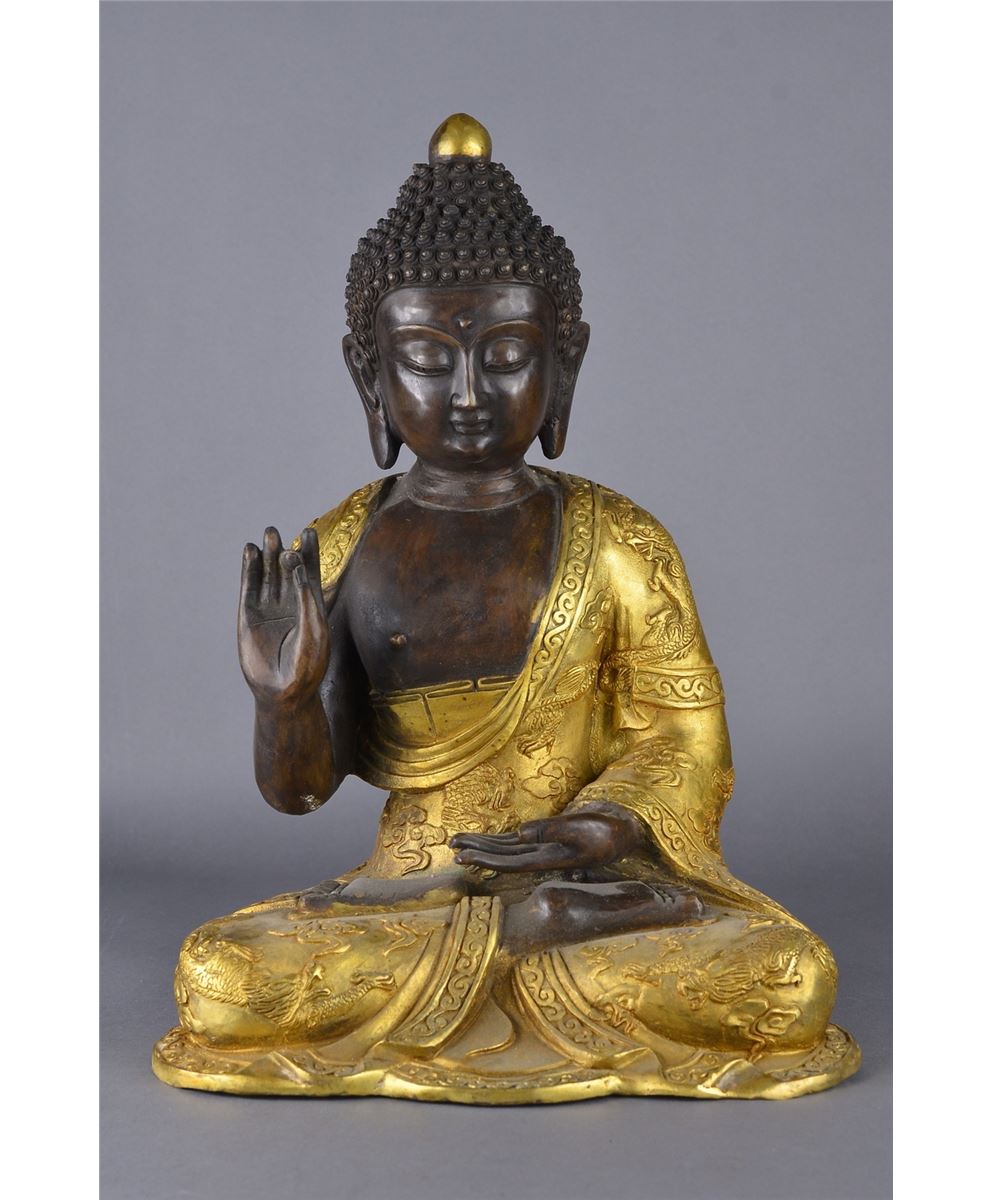Chinese bronze cast figure with gilt gold; featuring Buddha, 19th/20th Century; H: 37 cm, W: 28 cm, L: 18 cm, 6 kg (approx.)