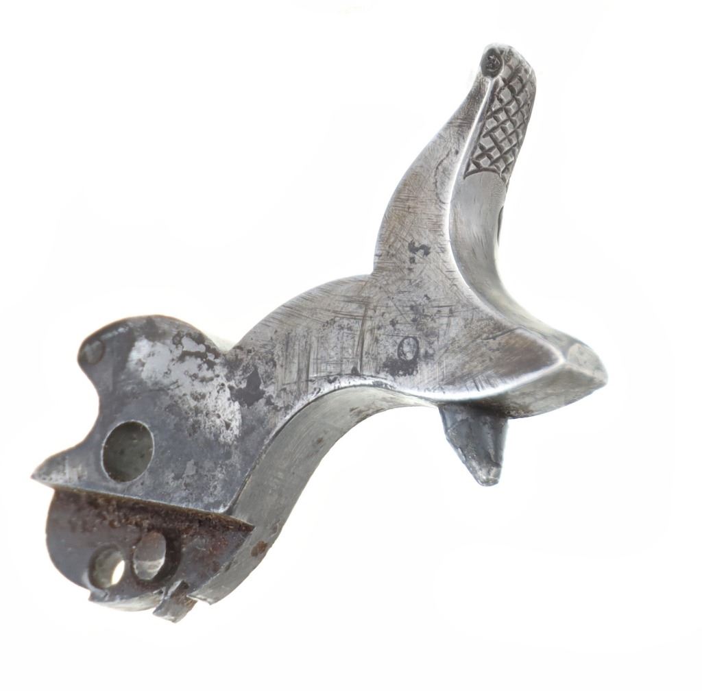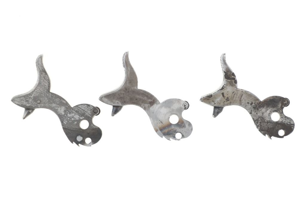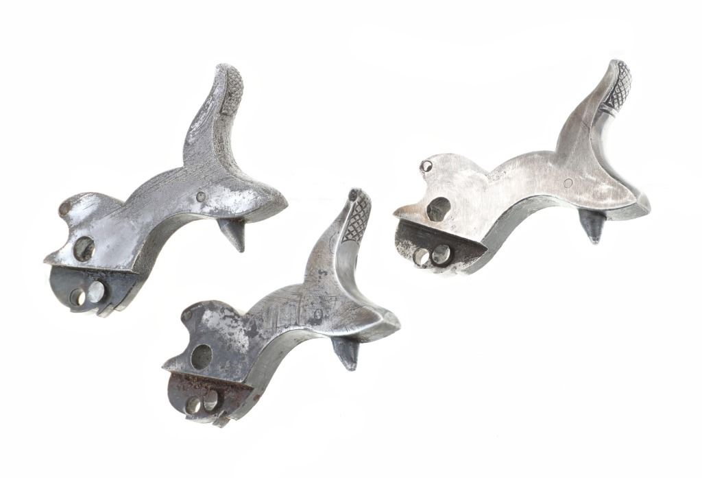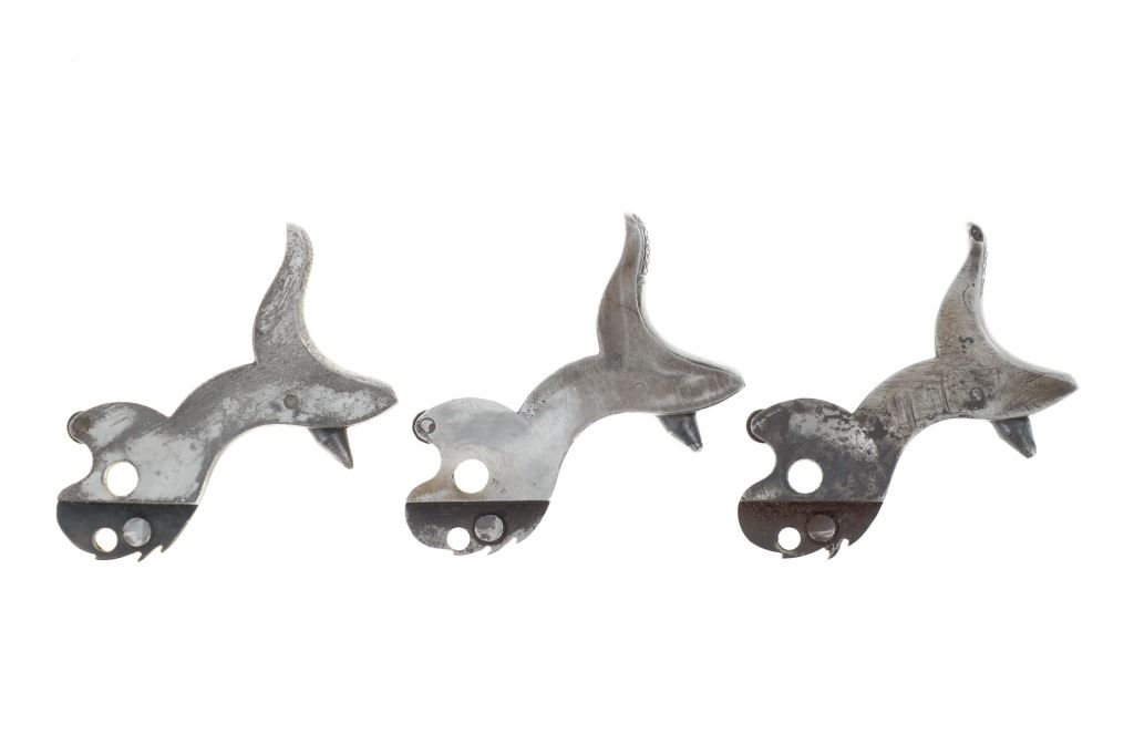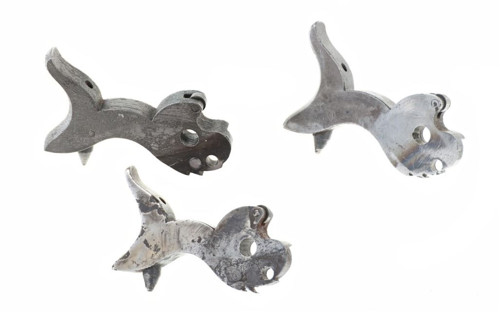 The lot features three hammers from the Colt Single Action Army Model 1873 revolver from the first generation circa 1873-1908. These show nine line knurling / checkering, two with borders and straight line below and one with a border and half moon line below. These each measure 2.5-inches by 1.75-inches by 5/16-inches.