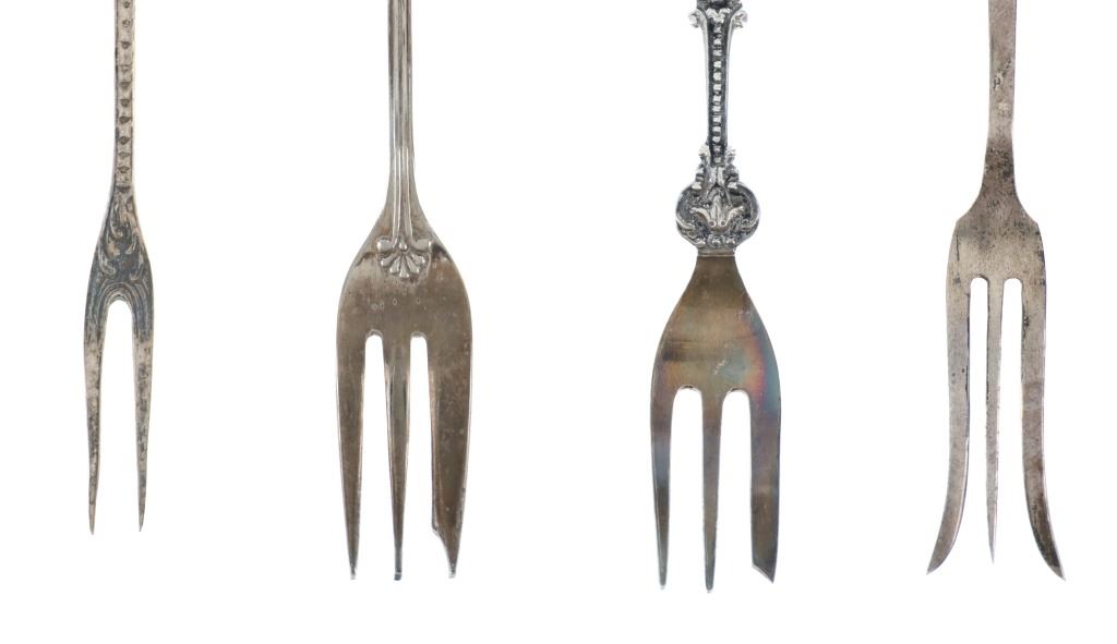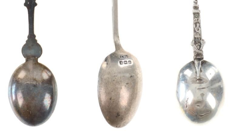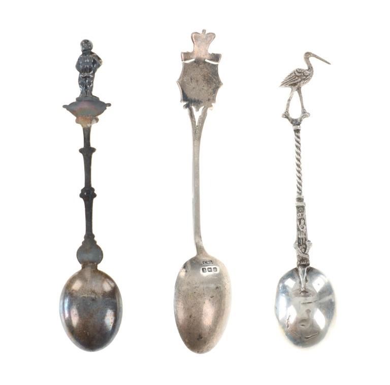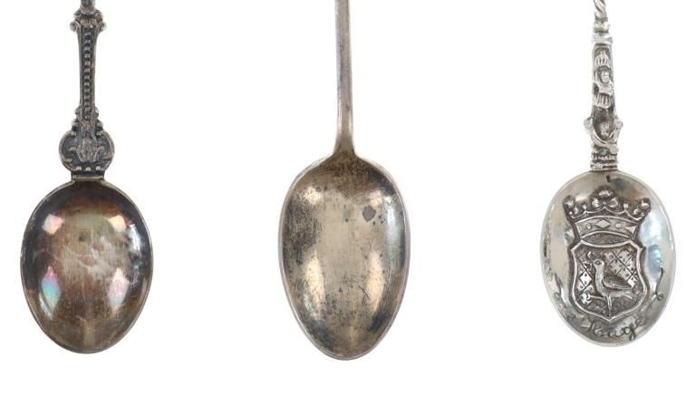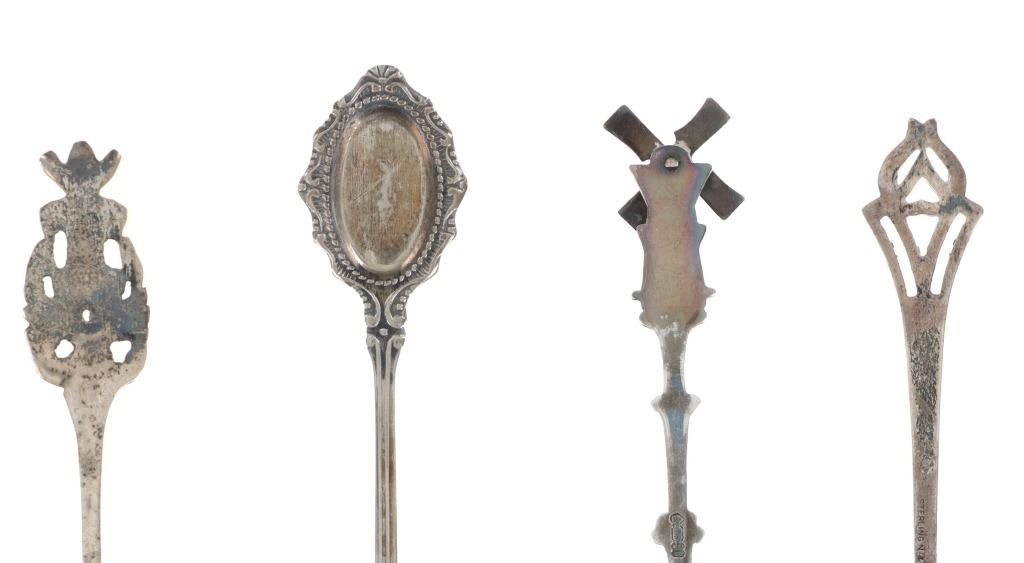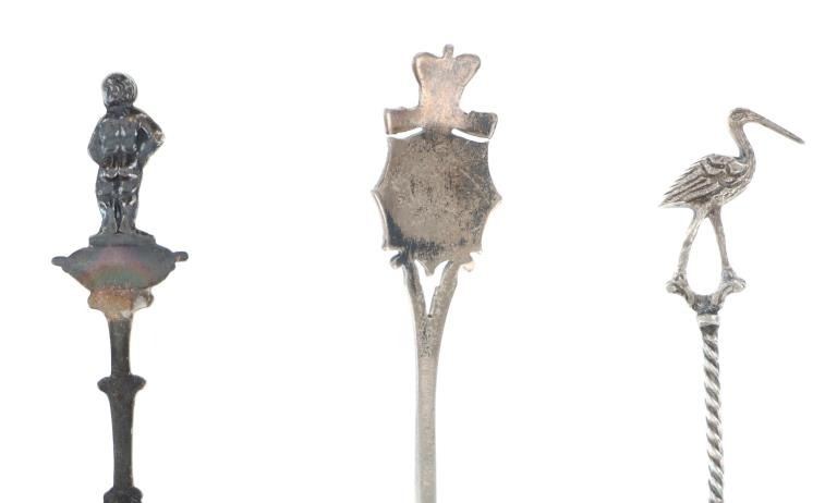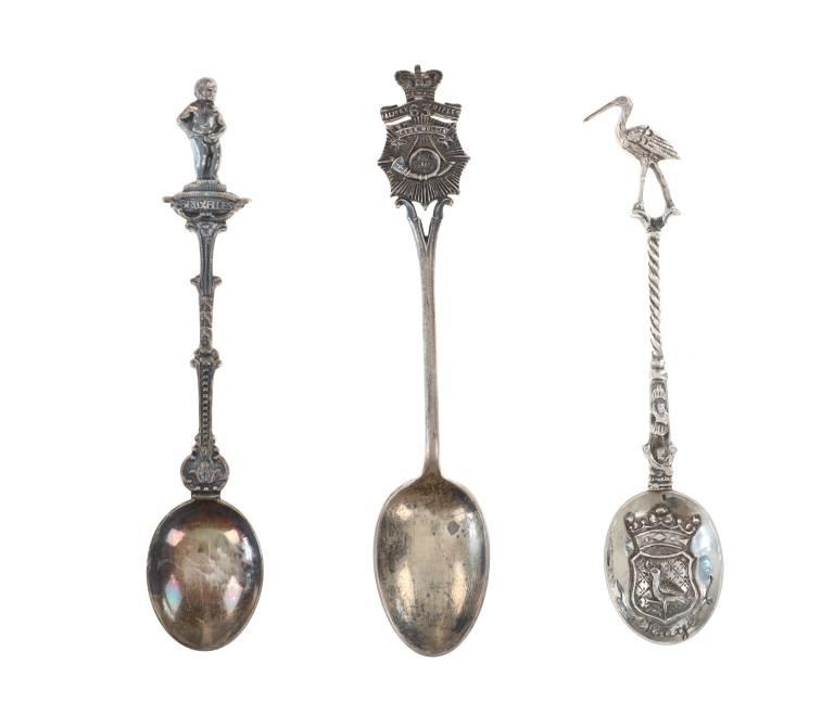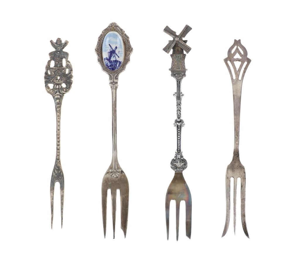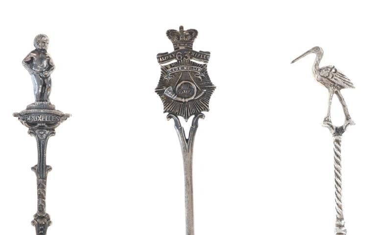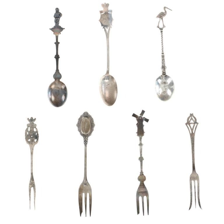 Featured in this lot is a collection of various decorative sterling forks and spoons from Europe circa 1800-1900s. The collection includes four forks and three spoons. The first spoon was made in Birmingham, England for Halifax Rifles in Canada circa 1932. Halifax, Nova Scotia, is home to the Canadian militia group known as the Halifax Rifles. The Halifax Volunteer Battalion of Rifles—officially known as the Halifax Rifles—was established on October 8, 1860. It was created in response to the rising hostilities between the United States and Britain at the time, as well as the potential threat of American annexation of British North American territories. During the Fenian Raids, a series of incursions by the Irish-American nationalist organization Fenian Brotherhood into Canadian territory, the Halifax Rifles took part in defending Canada. Both 1866 and 1870 saw these raids. The Halifax Rifles participated in World War I actively, like many other Canadian military units. They dispatched troops to fight in the Western Front and other European theaters with the Canadian Expeditionary Force. The unit's contributions to this war were recognized with several battle honors. The Halifax Rifles continued to serve as a militia unit during the interwar years, providing neighborhood defense and emergency training. During this time, the unit underwent a number of reorganizations and modifications. The Halifax Rifles continued to serve as a militia unit after World War II, taking part in training drills and assisting civil authorities in times of need and during natural disasters. Additionally, the unit has participated in a number of international peacekeeping operations. Today, the Halifax Rifles remain an active militia unit, contributing to the Canadian Armed Forces' reserve component. The spoon shows a highly decorated handle reading, "Halifax Rifles / Cede Nullis (Yield To None) / Canada 63". The bottom of the bowl shows British stampings and makers mark reading "L & S" for L. Spiers, the Birmingham town mark, the lion passant indicating the quality of silver and the letter "O" for the date it was made (1932). The spoon shows good condition overall with a patina from its antique age, but no signs of obvious damage are present. The spoon measures 5 1/16" L x 1" W x 1/4" H. The second spoon was made in Brussels, Belgium circa late 1870-1900. The spoon is stamped on the back but is illegible. The handle is highly decorated and shows a small sculpture of a man at the top of the handle. Below the sculpture it reads, "Bruxelles", showing it was made in Brussels, Belgium. The spoon shows a patina from its antique age but no signs of obvious damage are present. The spoon measures 4 7/8" L x 1" W x 1/4" H. The third spoon features a sterling construction and shows detailed decorations of a crane and a family crest in the bowl of the spoon. The bowl of the spoon shows a family crest with "Hage" inscribed underneath it. The neck shows a partial twist with the crane sitting at the top. The spoon shows good condition overall with some wear from its antique age and use over the years but no obvious signs of damage are present. The spoon measures 4 11/16" L x 1" W x 1/4" H. The first fork in this collection is a thin, two prong fork with a highly decorated handle and neck. The top of the handle shows a windmill facing the viewer head on, with intricate designs below it. The back of the neck is marked, "8305". The fork shows some slight wear and a light patina from use and its antique age, but no signs of obvious damage are present. The fork measures 4 1/2" L x 11/16" W. The second is a simple, three prong sterling fork with a cut handle. The back of the neck features stampings reading, "Sterling N & H". The fork shows some slight wear from its antique age and warm patina to the sterling but no signs of obvious damage is present. The fork measures 4 11/16" L x 11/16" W. The third fork in this collection shows a simple three prong design with a souvenir fork style handle showing a painted windmill in blue coloring against a white background. The spoon shows no markings. The fork shows good condition overall with no signs of obvious damage present. The fork measures 5 1/8" L x 7/8" W. The final fork in this collection is constructed of sterling silver and shows intricate designs through the neck and handle. The top of the handle shows a detailed windmill made of sterling. The wings of the windmill spin freely when moved. The neck of the fork shows high detail in its designs, while the back shows a makers hallmark reading "HH" and other unidentifiable stampings. The fork shows good condition overall with slight wear from its age and use through the years. No obvious signs of damage are noted. The fork measures 5 1/8" L x 13/16" W. The collective weight of these items is 99.9 grams.
