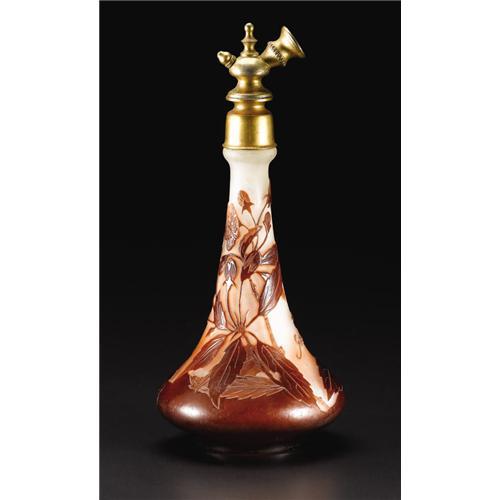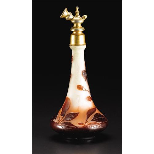 <B>A Galle Cameo Glass Perfume Atomizer</B></I><BR><BR>Galle, France<BR>Late Nineteenth/Early Twentieth Century<BR>Glass<BR>Signed <I>Galle</B></I> in cameo<BR>4.5 inches high (glass only)<BR><BR>With long slender neck tapering outward toward the base, the grey glass walls overlaid in cranberry red, cameo carved with a flowering branch.<BR><BR> <B>Condition Report:</B> Lacking tube and bulb from atomizer.<BR><BR><b>Shipping:</b> Requires 3rd Party Shipping (<a target="_blank" href="http://www.heritageauctions.com/common/shipping.php">view shipping information</a>)