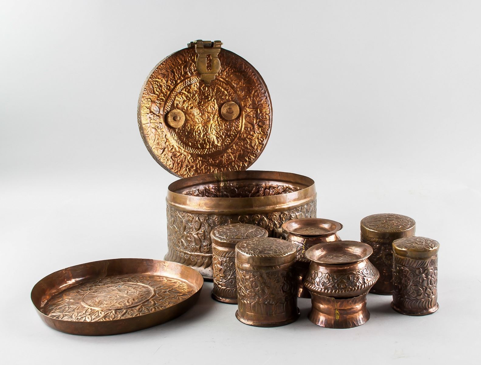 Chinese copper censer set; of cylinder form; carved with floral and leafy pattern; comprised of 8 pieces items including 1 big box; 1 plate, 2 small censer and 4 small cases with cap; 22 cm x 11.5 cm, 2480 grams