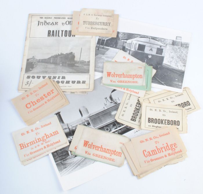 Including Clogher Valley Railway sign. Baggage, package and live stock labels. Railway and engine photographs and postcards. Pamphlets and reciepts. Railways include Clogher Valley, GNR, Sligo Leitrim and Nothern Counties etc. (50 items approx)