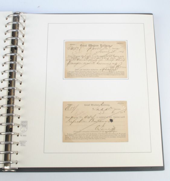 A large collection of Irish railway ephemera contained in two albums. The first a Lindner collectors album containing covers, letter heads and notes, the second witth handbills, receipts, pamphlets, documents, notes etc. Many companies covered including Midland Great Western, Dublin & South Eastern, Waterford, Wicklow, Wexford & Dublin, Athenry & Ennis Junction, Kilrush & Kilkee, Carlow & Wicklow, Clogher Valley, Limerick, Ennis & Killaloe Junction etc. Items ranging in dates from early 19th to 20th Century.(100+ items)