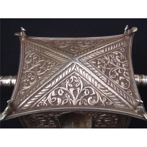 19th-20th. century Indian heavy silver hand-made objet d'art featuring a Jampan sedan chair (litiere). The silver is hand-chiseled in high relief with typical Islamic floral motif. The carving in silver is rendered at perfection with minuscule details. The roof of the Jampan palanquin chair has 4 birds (one in each corner).It is marked "silver" on the bottom. Dimensions: 13" X 4.5" (33 cm. X 11.5 cm.). Estimated value: $3000.