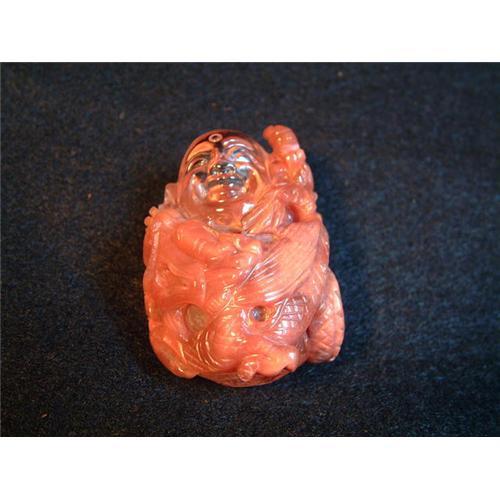 Antique Chinese natural rock crystal carving in shape of Buddha surrounded and enveloped by dragon. While the Buddha is transparent, the dragon has the natural coral color of the rock crystal skin. Master lapidary work combining the transparent rock crystal with the homogenous coral color of the rock's skin. Size: 6.3 x 5 cm. (2.5" X 2" ). Estimated value: $1750.