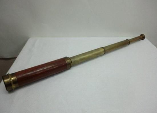 19th C 3 Draw Brass & Mahog Telescope Probably English, W/ Sliding Eyepiece Lens Cover; having a nicely toned polished brass surface, the largest cylinder having a mahogany cover; 36.5 in Fully Extended Length, 12.5in Closed, Unsigned MWF2384