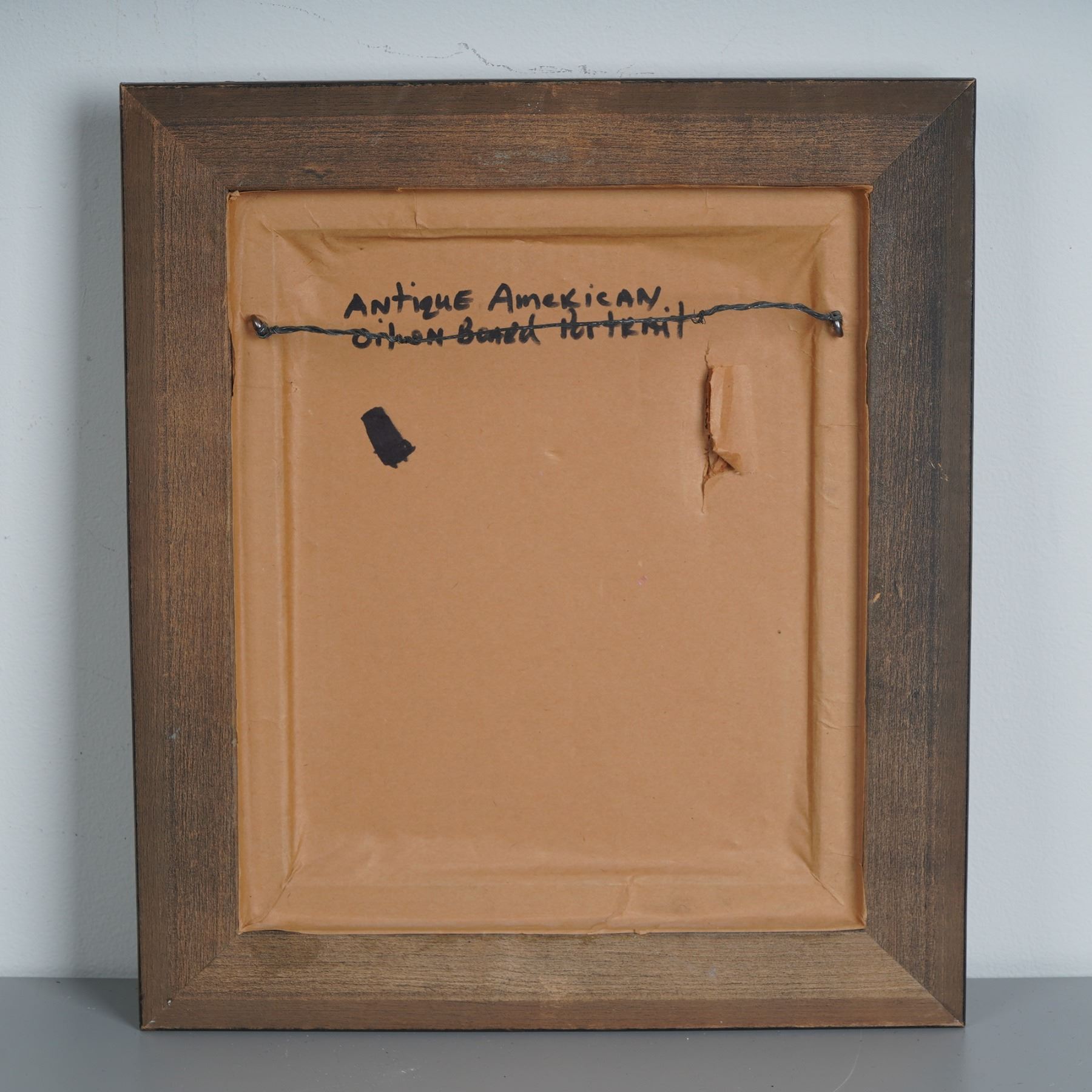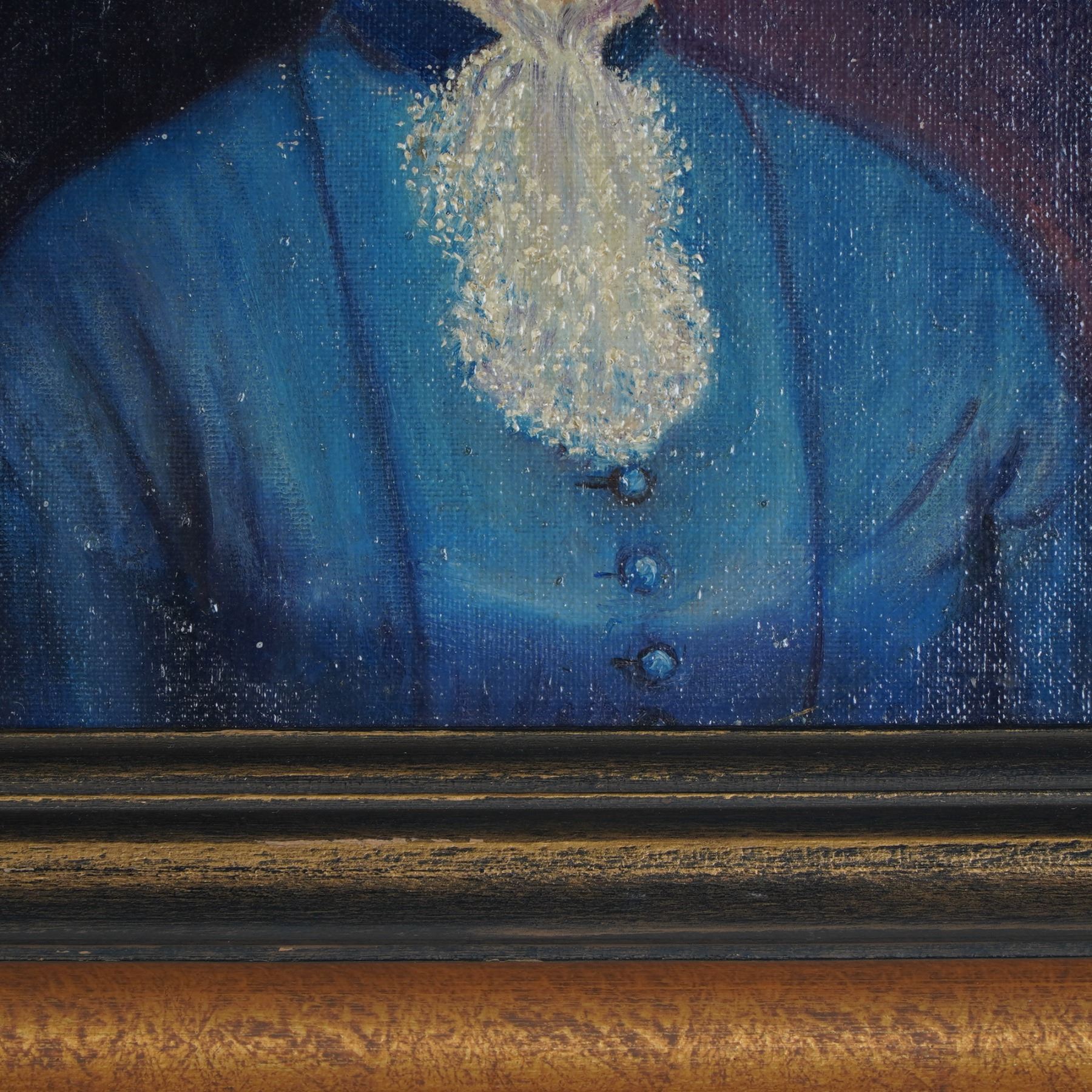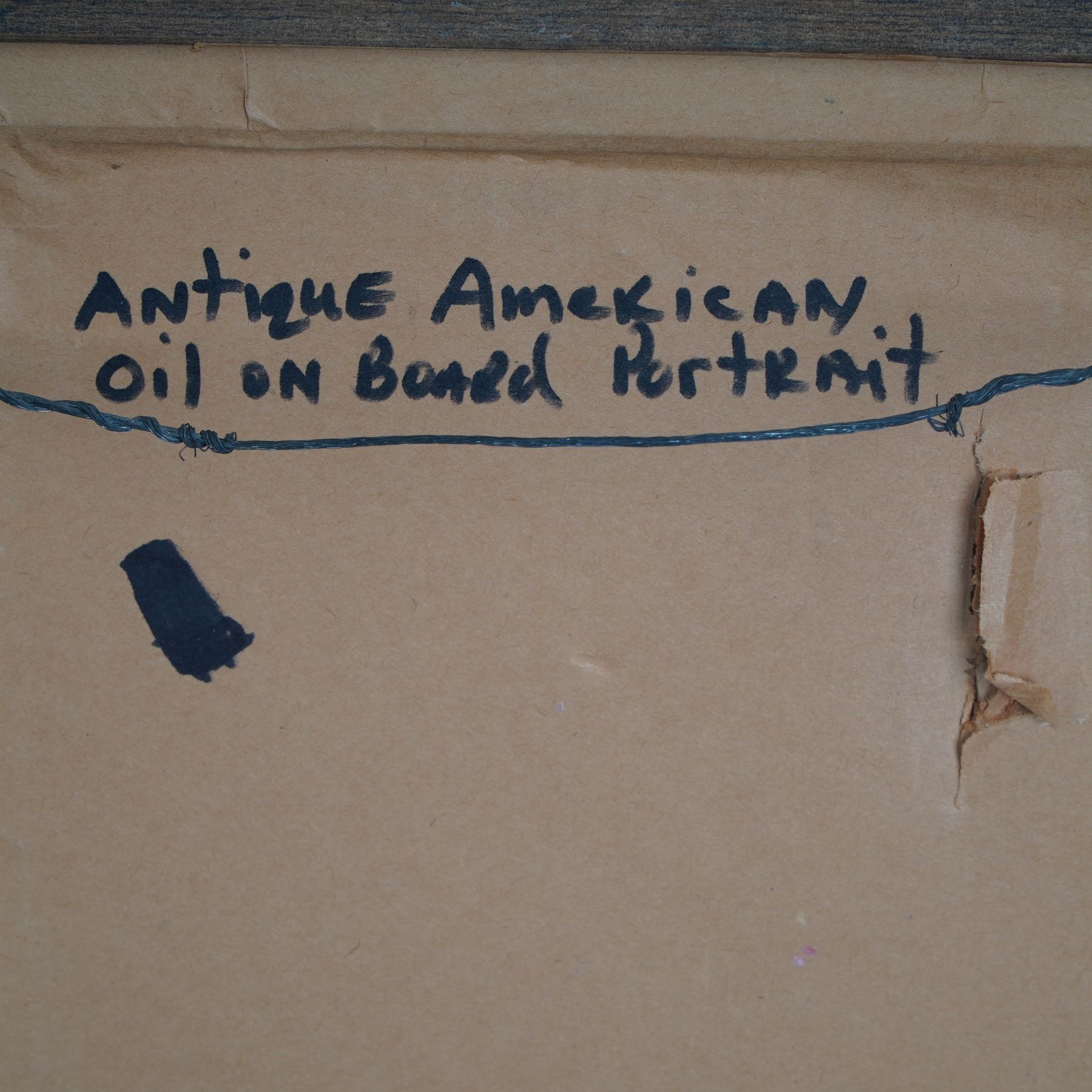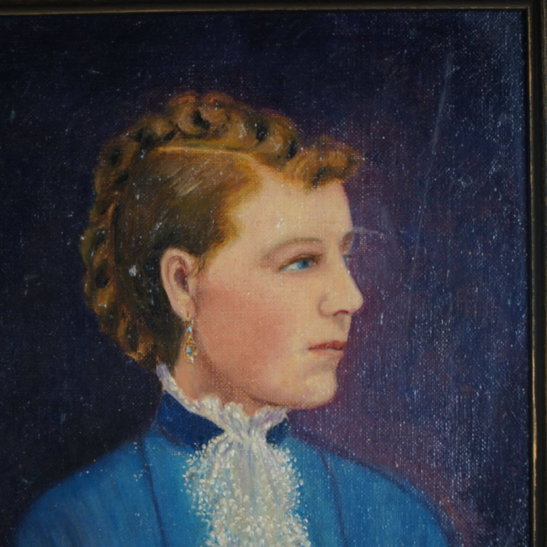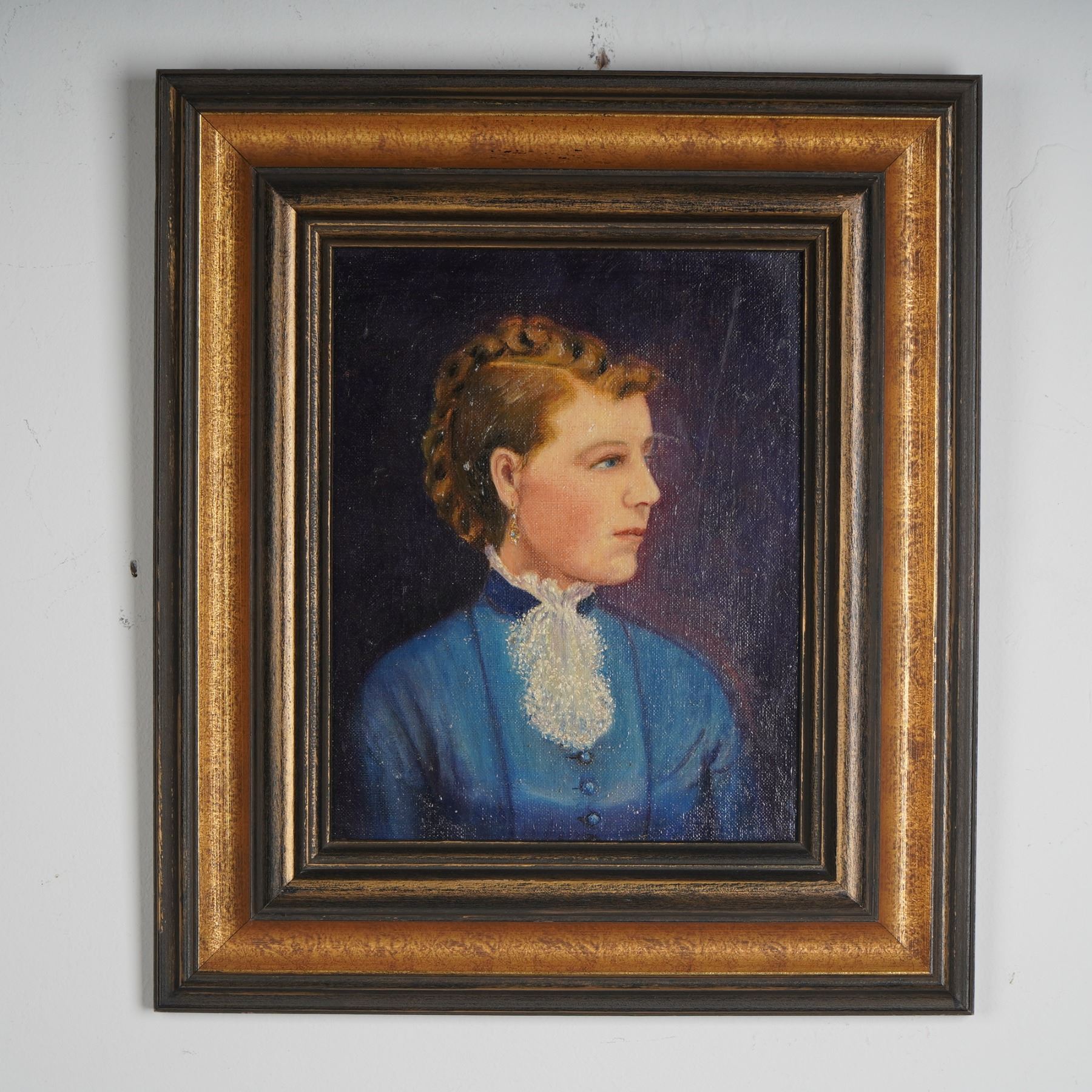 A captivating and finely executed 19th-century American oil on wood panel portrait of a young lady in profile, rendered with elegance and restraint. The sitter, dressed in a vivid blue garment adorned with a delicately textured lace jabot, gazes serenely to her right, her features imbued with both grace and dignity. The subject's softly curled, upswept hair and single drop earring further accentuate the period charm of this composition. The artist's initials A.C. are subtly signed in the lower right, affirming the hand behind this evocative work. The painting is housed in a rich, tiered frame with gilded accents that enhances its museum-worthy presence. Labeled verso in handwritten script as Antique American Oil on Board Portrait. This is a remarkable piece of Americana portraiture, ideal for collectors of 19th-century decorative arts.