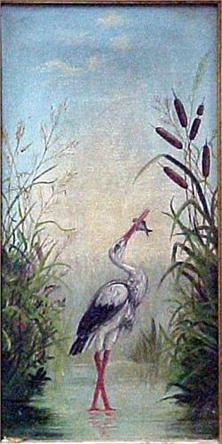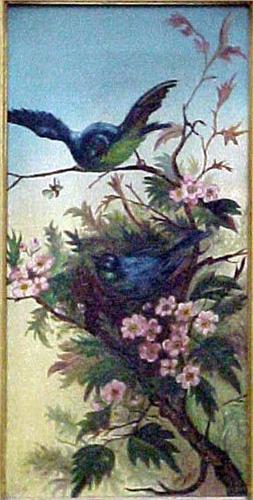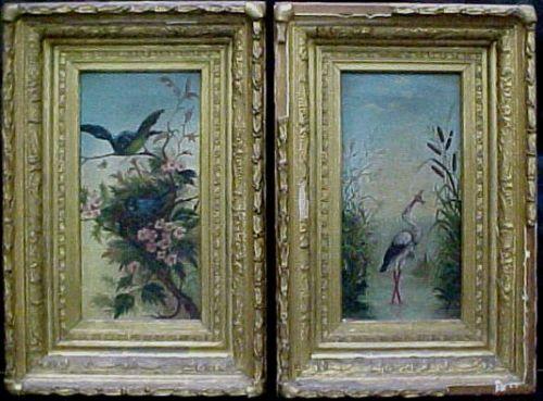 19th C. American School - a pair of oils on canvas of birds; the first depicts birds in tree (one in nest); the second portrays stork with fish in beak; images measure 11 1/2 inches x 5 1/2 inches; both framed; (some loss to both frames)