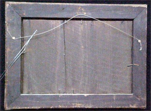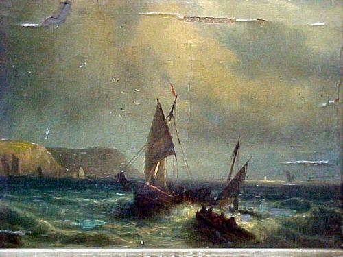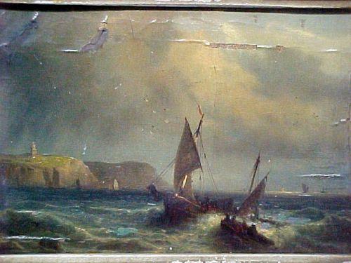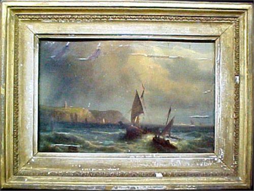 19th C. American School; framed oil on canvas; ships at sea; unsigned; image measures 5 1/2" x 8" (small areas of loss of paint in sky and lower left) Estimate 80/150"
