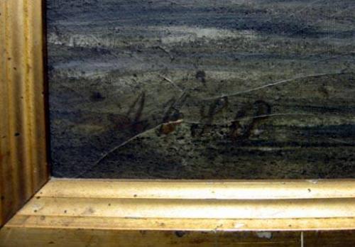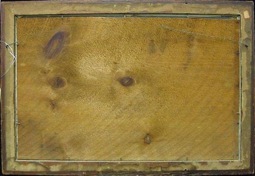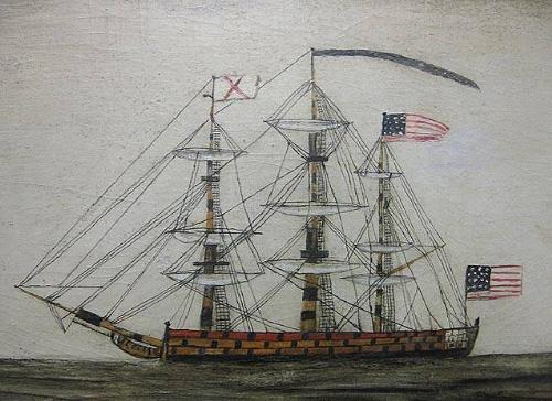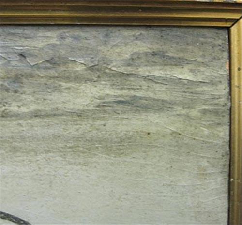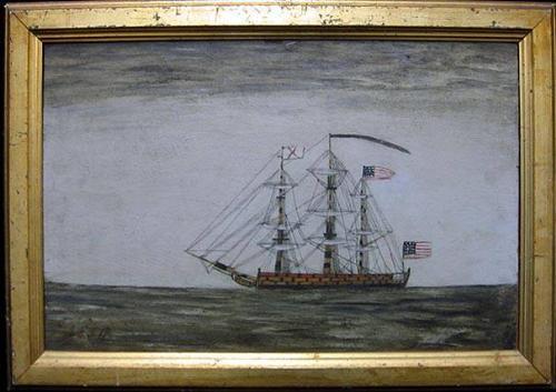 19th C. American School; oil on studio board of three mast schooner; signed( L. L.) with initials A. H. L. P.; framed; image measures 12" x 19" (overall crazing)