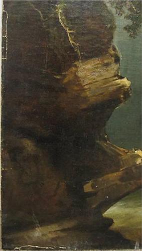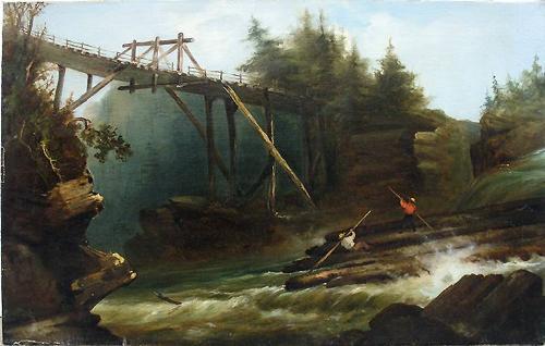 19th C. American School; two men riding logs down the river; image size 22" x 34" (loss at left stretcher edge)