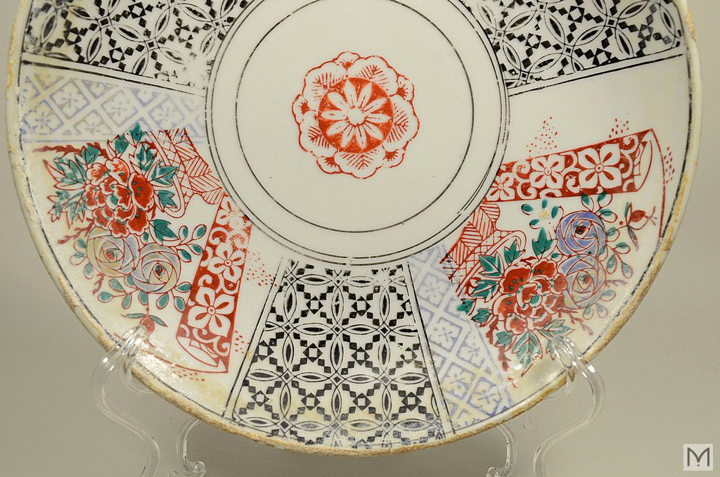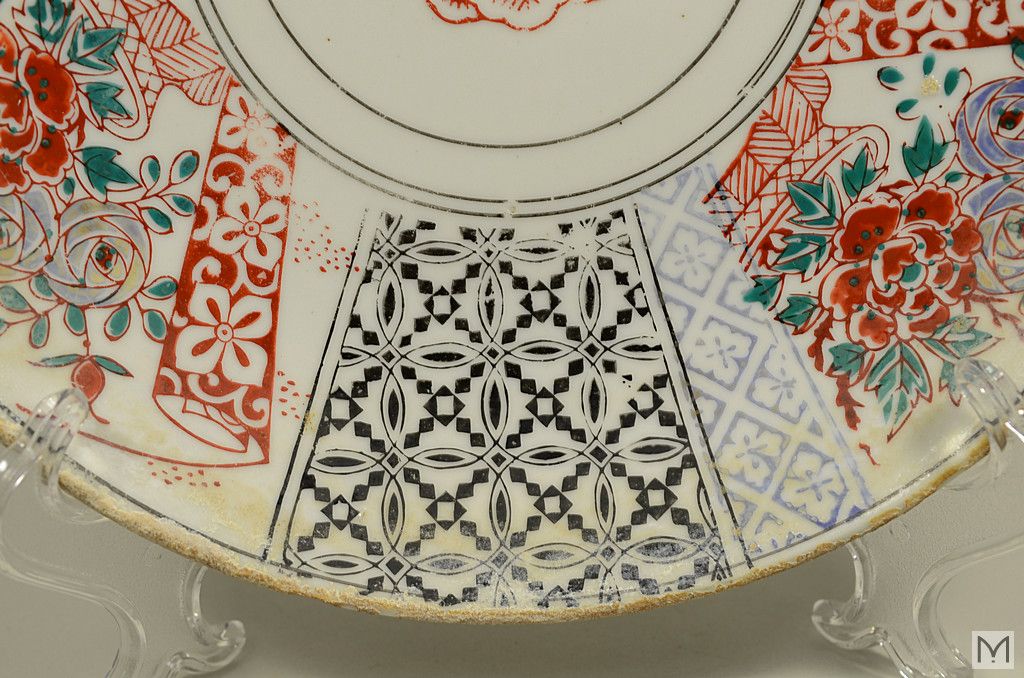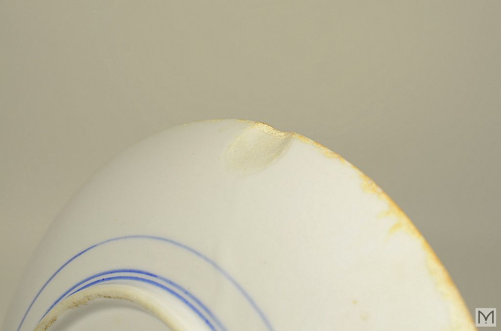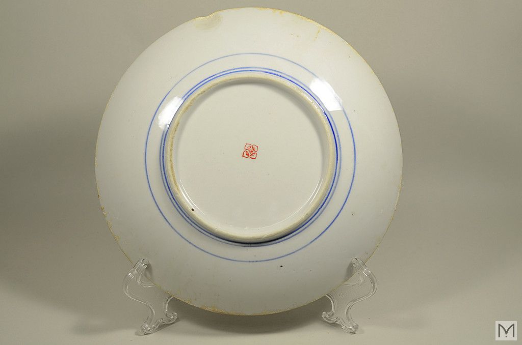 Very fine antique condition. Expected wear to painted decoration and minor chips along edge/rim. One large chip only visible from back of plate (as shown in images)