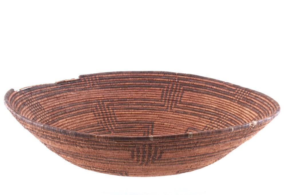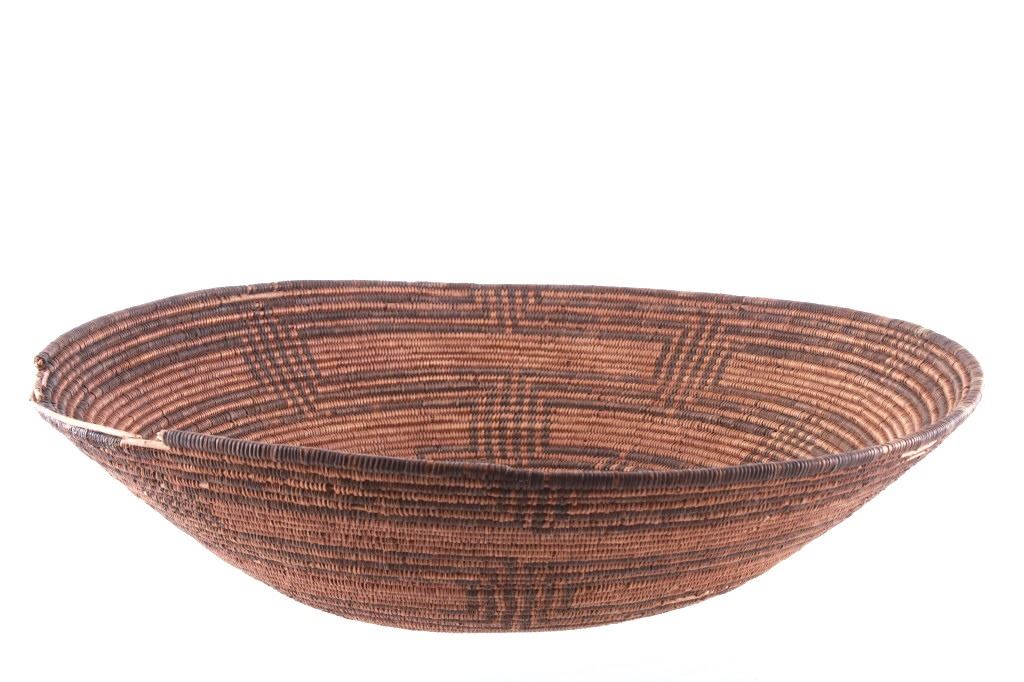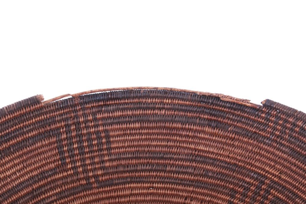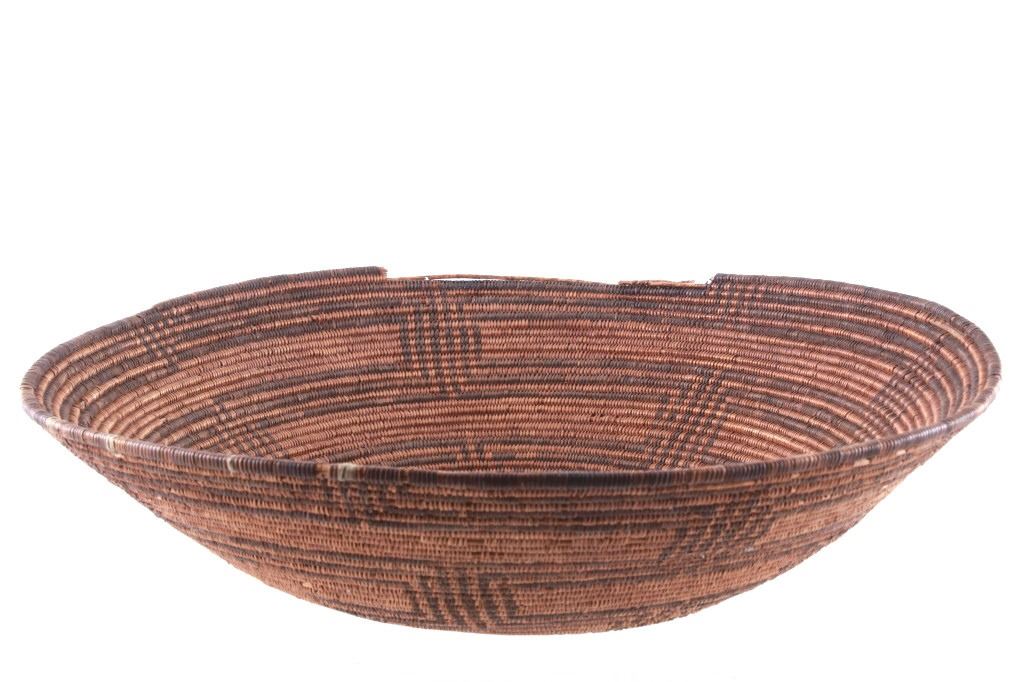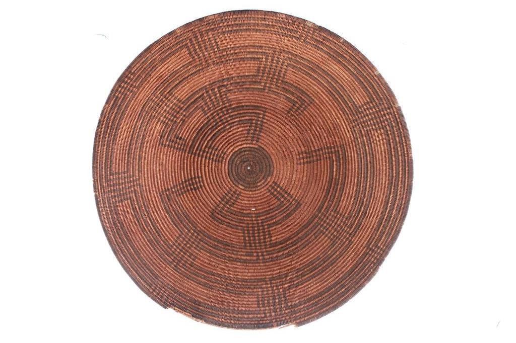 Featured in this lot is an Apache polychrome hand woven wedding tray circa 1880-1890. The wedding basket shows a wonderfully and professionally crafted Sharp-Thorned Devil's Claw which produces a highly desirable brown to black for "negative designs", and shows a polychrome geometric pattern adorning the inside of the hand woven basket and shows geometric patterns adorning the center of the basket and the side walling of the basket. The basket features a willow rim and frame of the coiled basket. The Apache are a group of culturally related Native American tribes in the Southwestern United States, which include the Chiricahua, Jicarilla, Lipan, Mescalero, Mimbreño, Ndendahe (Bedonkohe or Mogollon and Nednhi or Carrizaleño and Janero), Salinero, Plains (Kataka or Semat or "Kiowa-Apache") and Western Apache (Aravaipa, Pinaleño, Coyotero, Tonto). Distant cousins of the Apache are the Navajo, with whom they share the Southern Athabaskan languages. The various Apache tribes are all well-known for their basket weaving with the largest of the woven baskets being the large olla basket. The condition of this Apache wedding tray is is fair to good with some slight damage to the rim of the basket, but otherwise it shows fair to good overall condition. The measurements of this basket are 4" x 19" x 19". Provenance: From the renowned Sundog Fine Art Bozeman, Montana collection and collected by Bruce VanLandingham. Bruce VanLandingham was a pillar in the American Indian collecting community and a respected expert. Along with being an avid collector, Bruce also was the sole owner of Sundog Fine Art Gallery in Bozeman, which was both part museum and gallery.*