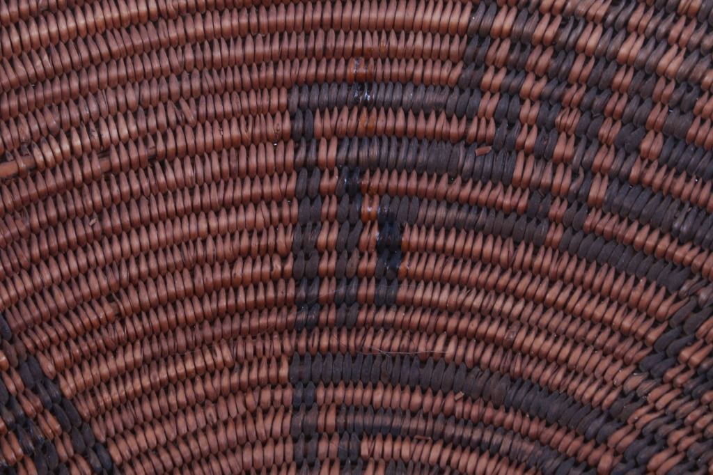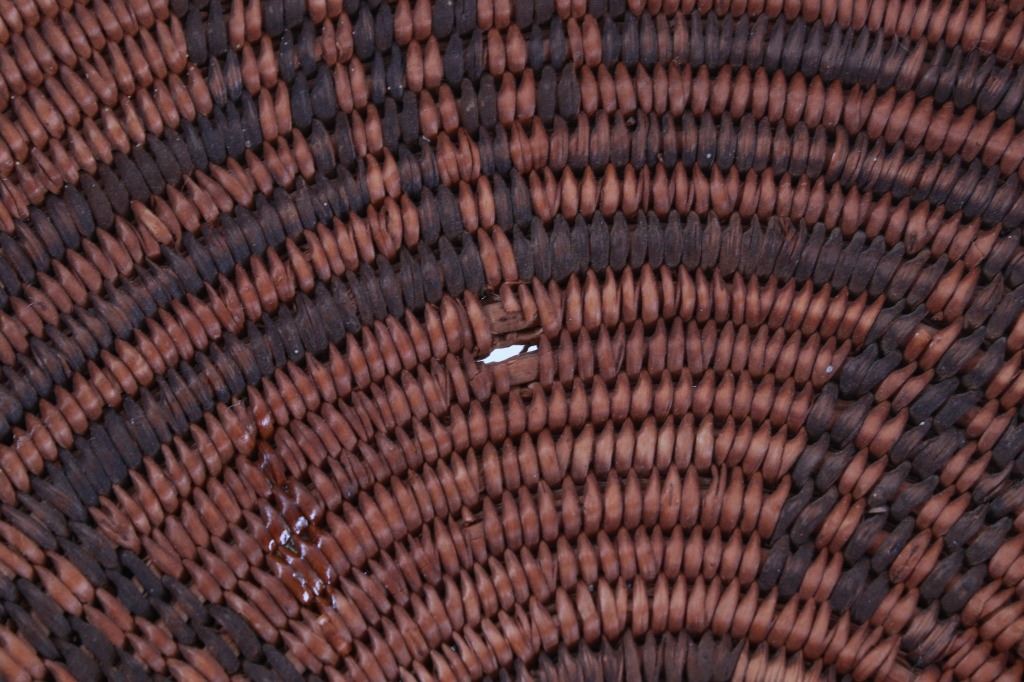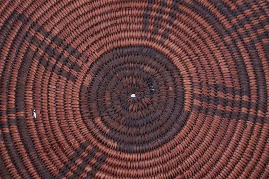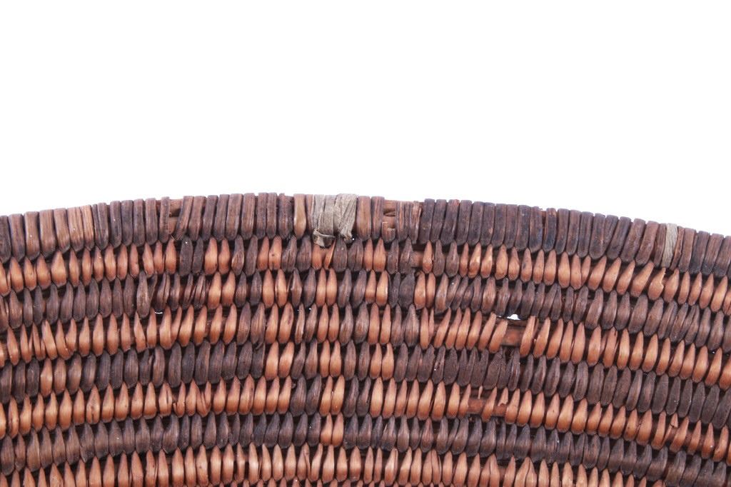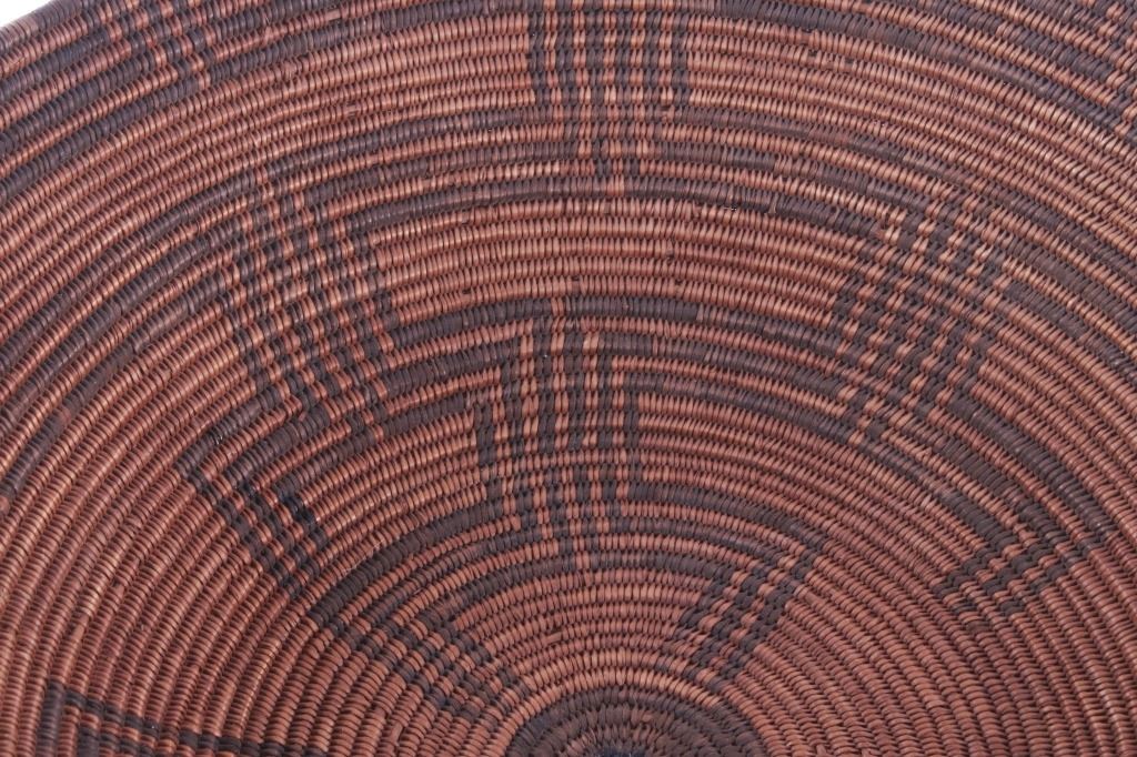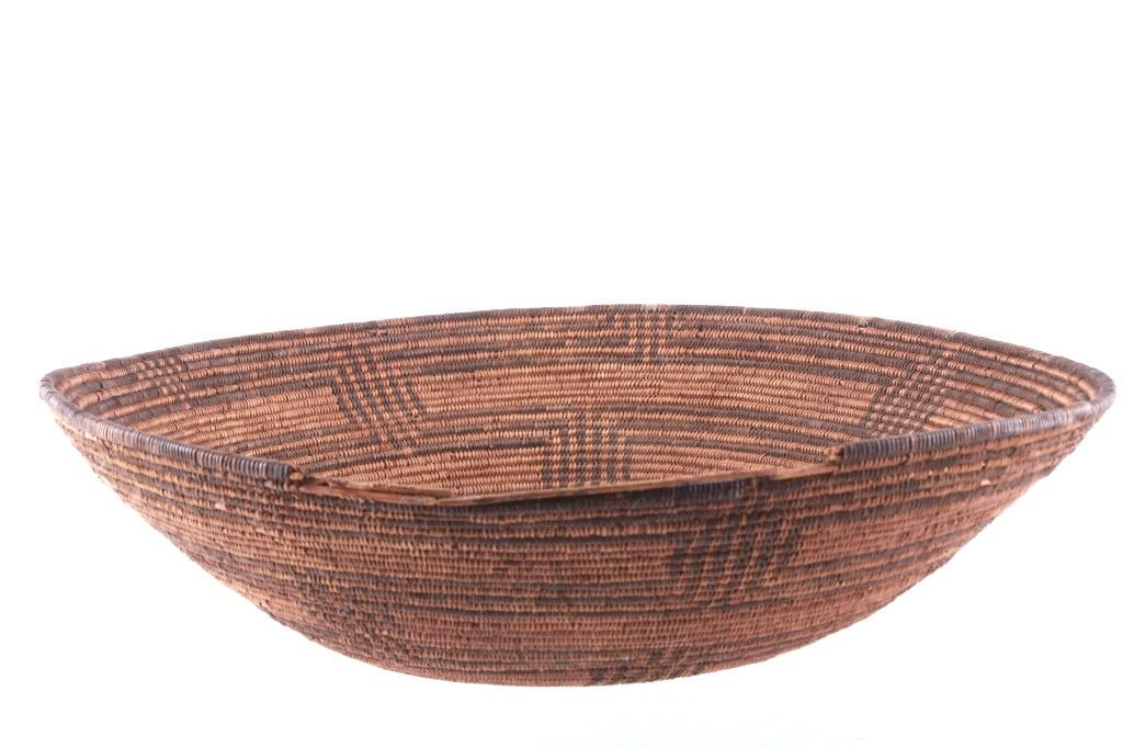 Featured in this lot is an Apache polychrome hand woven wedding tray circa 1880-1890. The wedding basket shows a wonderfully and professionally crafted Sharp-Thorned Devil's Claw which produces a highly desirable brown to black for "negative designs", and shows a polychrome geometric pattern adorning the inside of the hand woven basket and shows geometric patterns adorning the center of the basket and the side walling of the basket. The basket features a willow rim and frame of the coiled basket. The Apache are a group of culturally related Native American tribes in the Southwestern United States, which include the Chiricahua, Jicarilla, Lipan, Mescalero, Mimbreño, Ndendahe (Bedonkohe or Mogollon and Nednhi or Carrizaleño and Janero), Salinero, Plains (Kataka or Semat or "Kiowa-Apache") and Western Apache (Aravaipa, Pinaleño, Coyotero, Tonto). Distant cousins of the Apache are the Navajo, with whom they share the Southern Athabaskan languages. The various Apache tribes are all well-known for their basket weaving with the largest of the woven baskets being the large olla basket. The condition of this Apache wedding tray is is fair to good with some slight damage to the rim of the basket, but otherwise it shows fair to good overall condition. The measurements of this basket are 4" x 19" x 19". Provenance: From the renowned Sundog Fine Art Bozeman, Montana collection and collected by Bruce VanLandingham. Bruce VanLandingham was a pillar in the American Indian collecting community and a respected expert. Along with being an avid collector, Bruce also was the sole owner of Sundog Fine Art Gallery in Bozeman, which was both part museum and gallery.*
