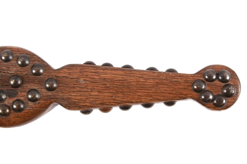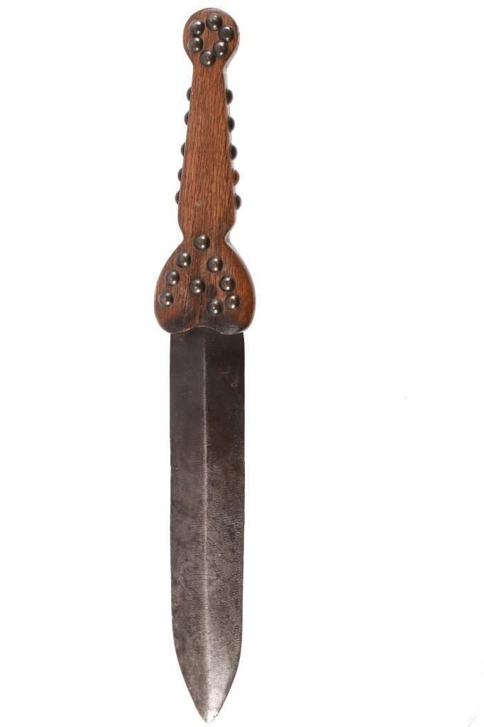 This is a fantastic Blackfoot / Blackfeet Native American Indian dag fighting knife dating to the 19th Century. Provenance: Poulin's (James D. Julia) Auction, Ex-Paris, France private museum collection, sold in 2015 as circa 1850 by NAAC. The piece is of a very large, heavy, menacing size and the construction shows a thick, heavy blacksmith forged bastard rasp file with thick, raised medial ridge on one side, which is set and secured with poured bullet lead to a phenomenal quarter sawn oak, hardwood, beaver back paddle handle. The piece has a traditional heart beaver tail paddle hilt shape with incised forefinger rest and tapering angled gripping area, which ends with a rounded pommel end. Both sides of the knife handle show brass covered metal tacks; at the top is a heart with central dot, five-point line on each side, and six-point circle on each side of the round pommel end. The handle is quarter sawn oak, and the poured bullet lead securing it can be seen at the blade connection point on each side. The rasp lines have been forged flat but can still be seen, and the blade has a nice dark original coloring. Provenance: From the ex-collection of Ralph Parr of London, England, from the ex-private-museum collection of Historic Native American Artifacts and Weapons in Paris, France—sold by NAAC in 2015 as a Blackfoot circa 1850 example and found to be an authentic Native American dag knife by the experts at Poulin Antiques. Measures overall 17.75" L x 2 5/8" W. This is truly a fantastic 1800's examples. The front has a crack and one missing tack, which exposes the nice, rich, aged wood beneath, further lending to the piece’s early authentic age. This is one of the largest examples we have offered for sale.*