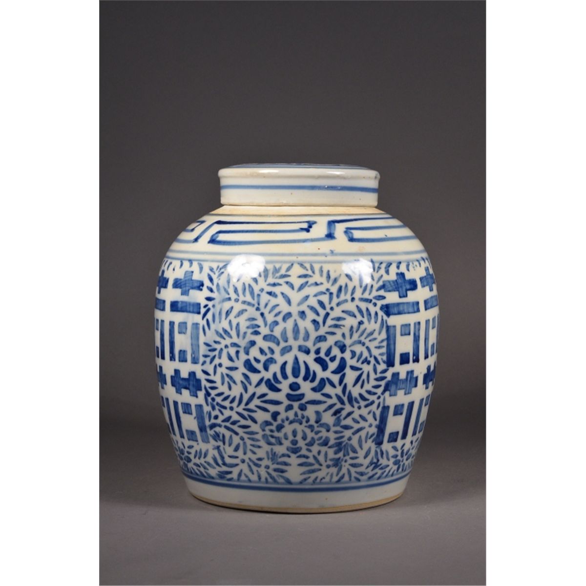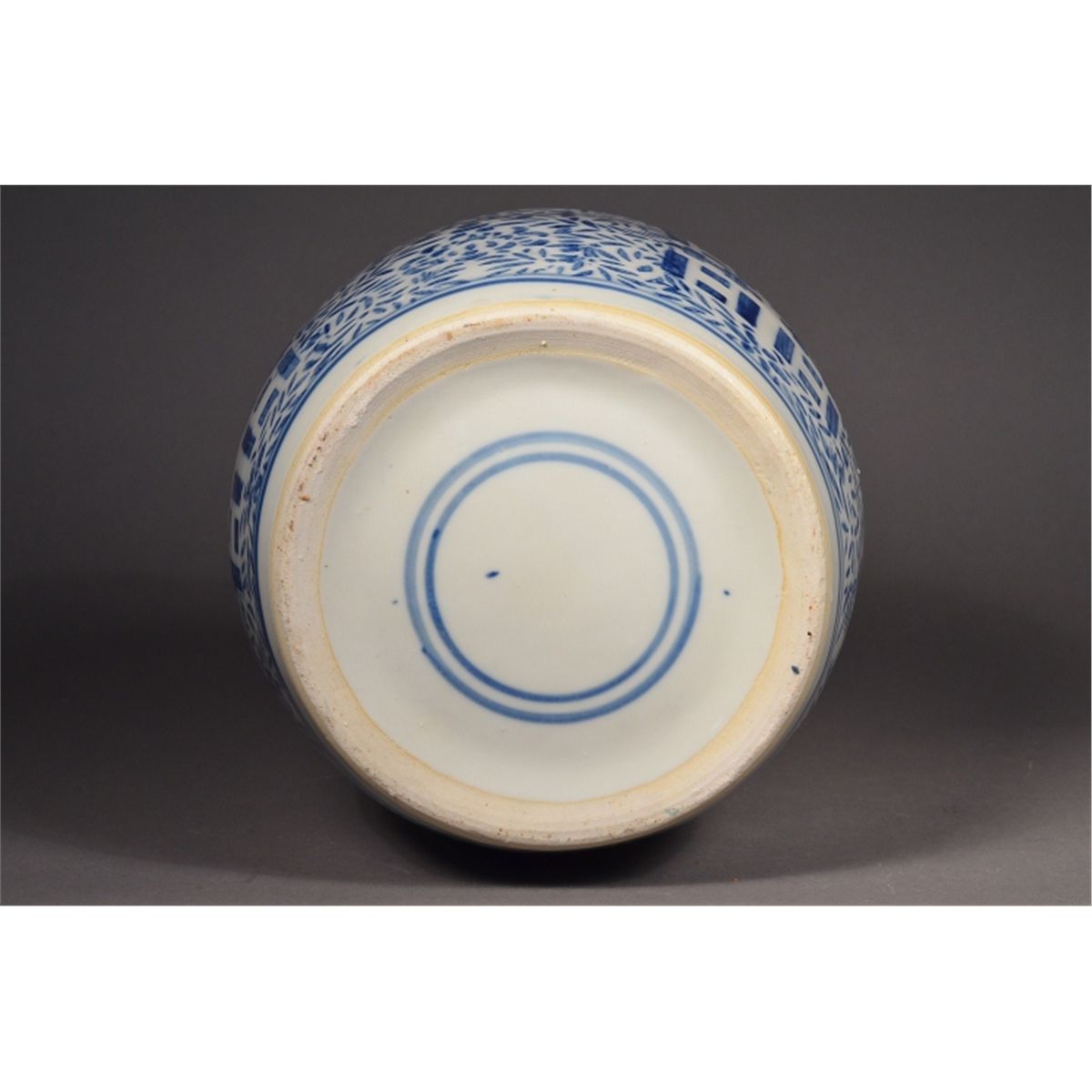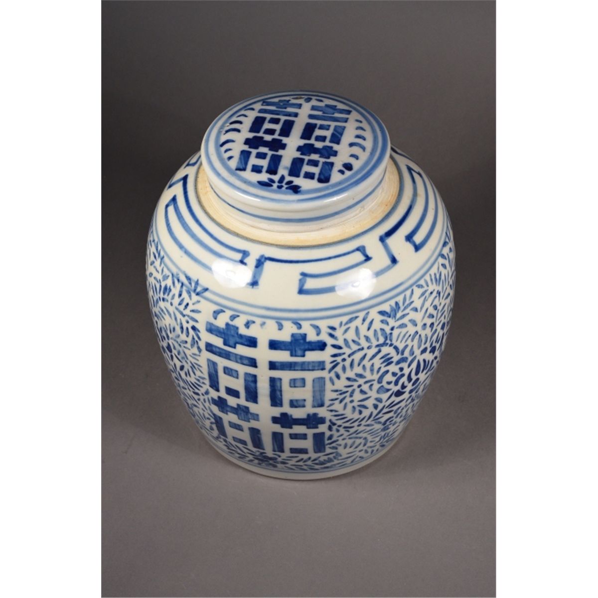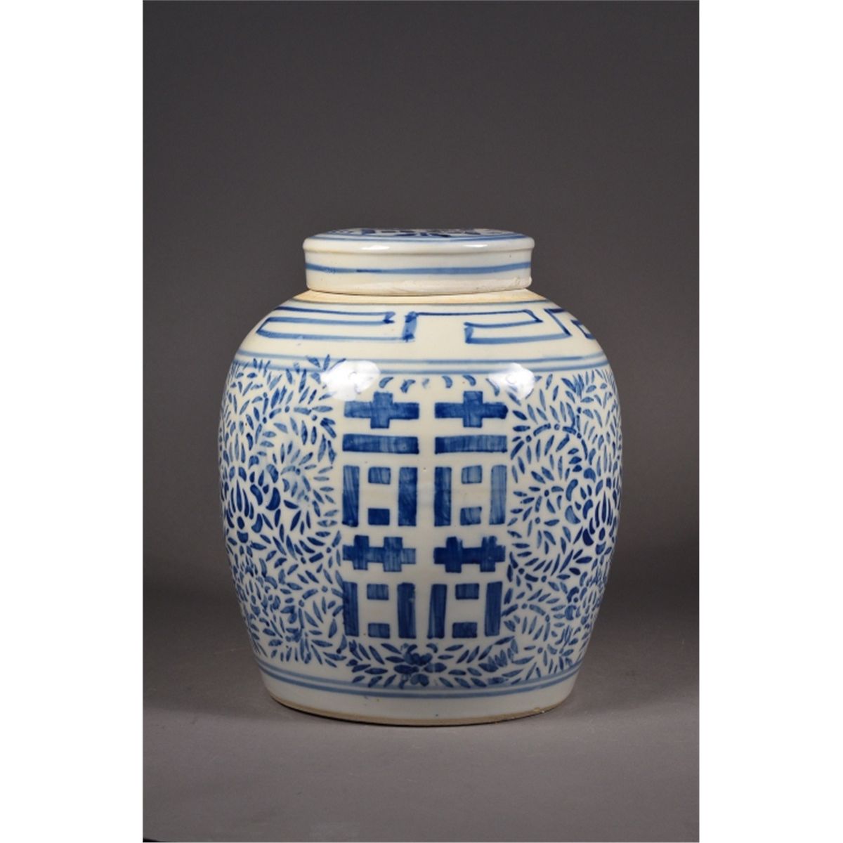 19th Century Chinese blue and white ginger jar: of ovoid form: the body featuring "Double Happiness" design underglazed in blue between double rings; the shoulder featuring broad key-fret band; double ring reign mark on base; H: 25 cm, D: 20 cm