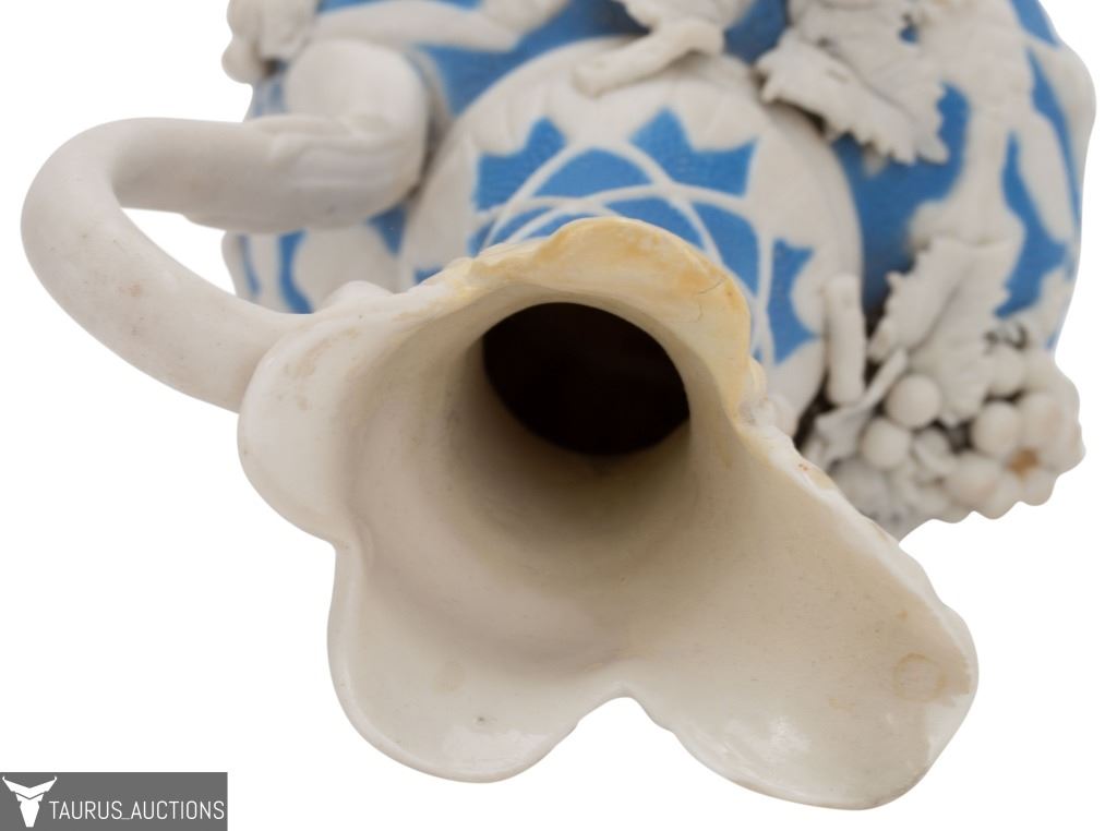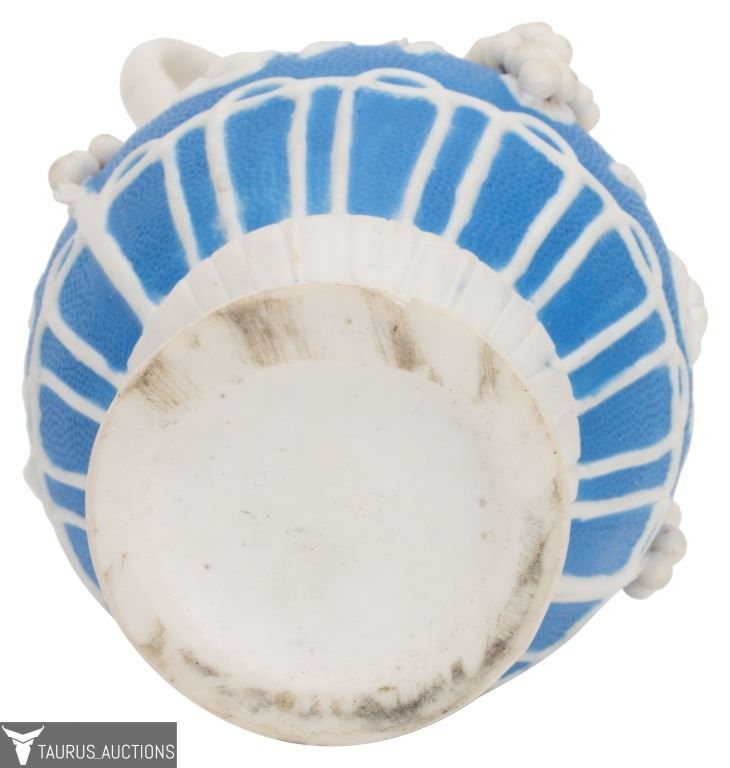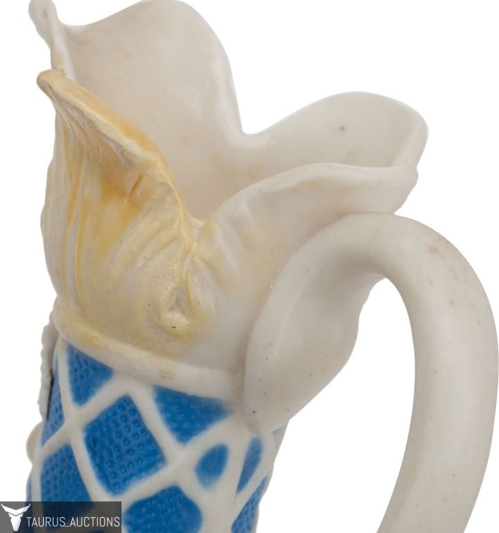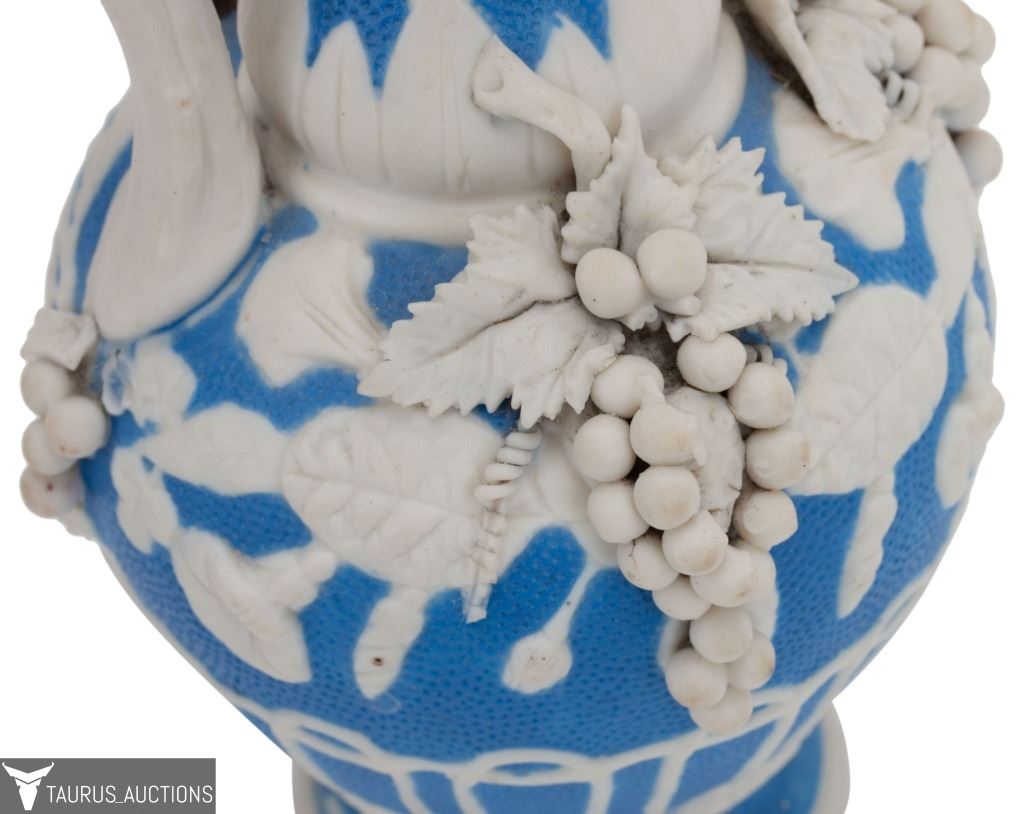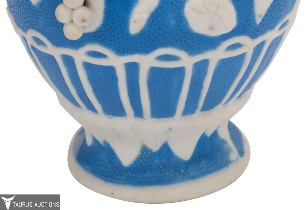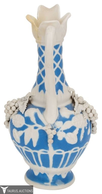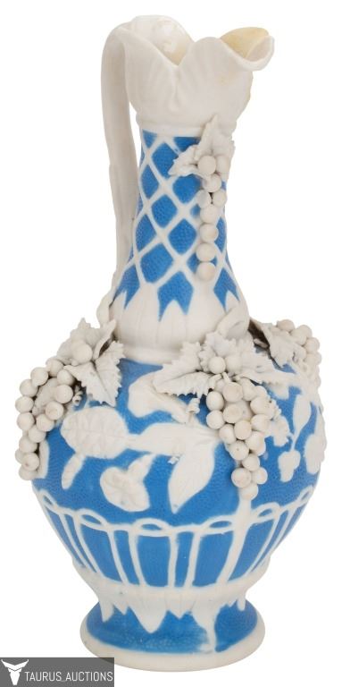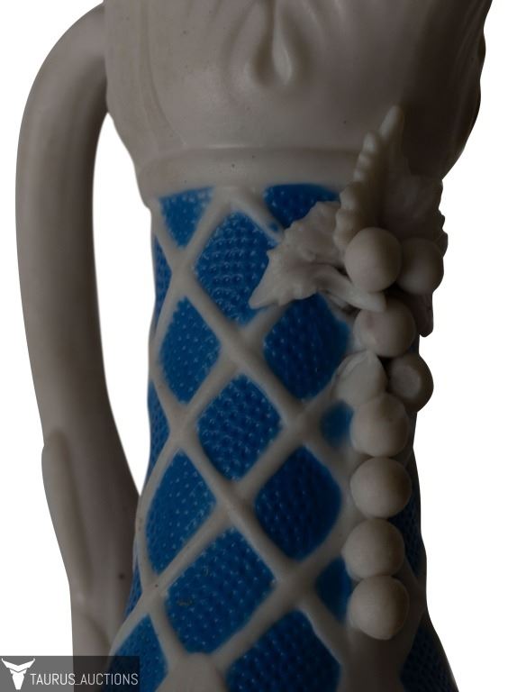 Item/Description: Parian Ware unglazed, white bisque porcelain ewer / pitcher with high relief, applied grape, vine, leaf and lattice motif, with a base of blue. No noticeable markings or signature. (Staffordshire, Mintons. Bennington)
