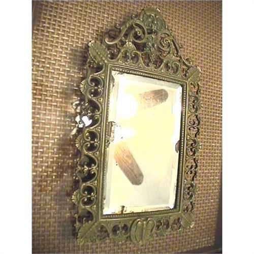 </font></strong>19th C Antique Brass Verdigris Openwork Figural Table/Vanity/Wall Mirror, depicting Bacchus, Roman god of wine and intoxication, at the head. Adorned with great beaded corner leaves and grape clusters, scrolls and fans. One small break in the openwork at bottom of frame, not easily detected. Gorgeous verdigris and patina. Heavy brass openwork frame with brass plate backing, missing 2 mid-section screws, and supporting easel--makeshift wire hanging loop in its stead. A good bit of original silvering loss to the original beveled mirror (probably 10%-15% loss of silver), as can be detected in the pictures. An amusing old newspaper clipping and other papers found tucked behind the backing, and may help determine a more accurate date. Mirror frame measures 14.5" high by 8" wide by .5" deep (no back easel). Buyer pays $15.00 flat shipping in continental U.S.</font>