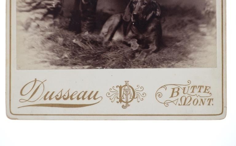 This is an original albumen cabinet card photograph by Angelo J. Dusseau (1842-1908) in Butte, Montana Territory in the 1880s of a Montana man in buckskin hunting coat holding a Trout in one hand, shotgun in the other, pistol in his belt and dog at his foot. A.J. Dusseau's true calling, as a photographer, began in Deer Lodge around 1874, and he moved to the thriving town of Butte by 1876 or 1877. By 1882, his residence and studio were both located in "The House that Jack Built," a two-story structure on the junction of Broadway and Main that now houses the Hirbour Tower. His sign, "Dusseau the Photographer," adorned the Main Street side of the building until it was replaced by the Hirbour in 1901. After Desseau died in 1908, R. Thompson, his business partner at the time, took over operations. This photo shows a man posing for a photo in the Butte studio as he holds a fish in one hand, the barrel of his rifle in the other and has his dog laying down near his feet. The man has a small smile on his face and sports a mustache. He wears a cowboy hat and shotgun shells around his waist. The bottom of the photo is marked reading, "Dusseau / Butte, Mont.". The back of the cabinet card reads, "A.J. Dusseau Portraits / Butte, Mont. / N.E. Cor. Main St. And Broadway". The photo shows good condition overall with little to no wear present and no signs of damage noted. It measures 6 5/8" L x 4 1/4" W and weighs under 6 ounces.