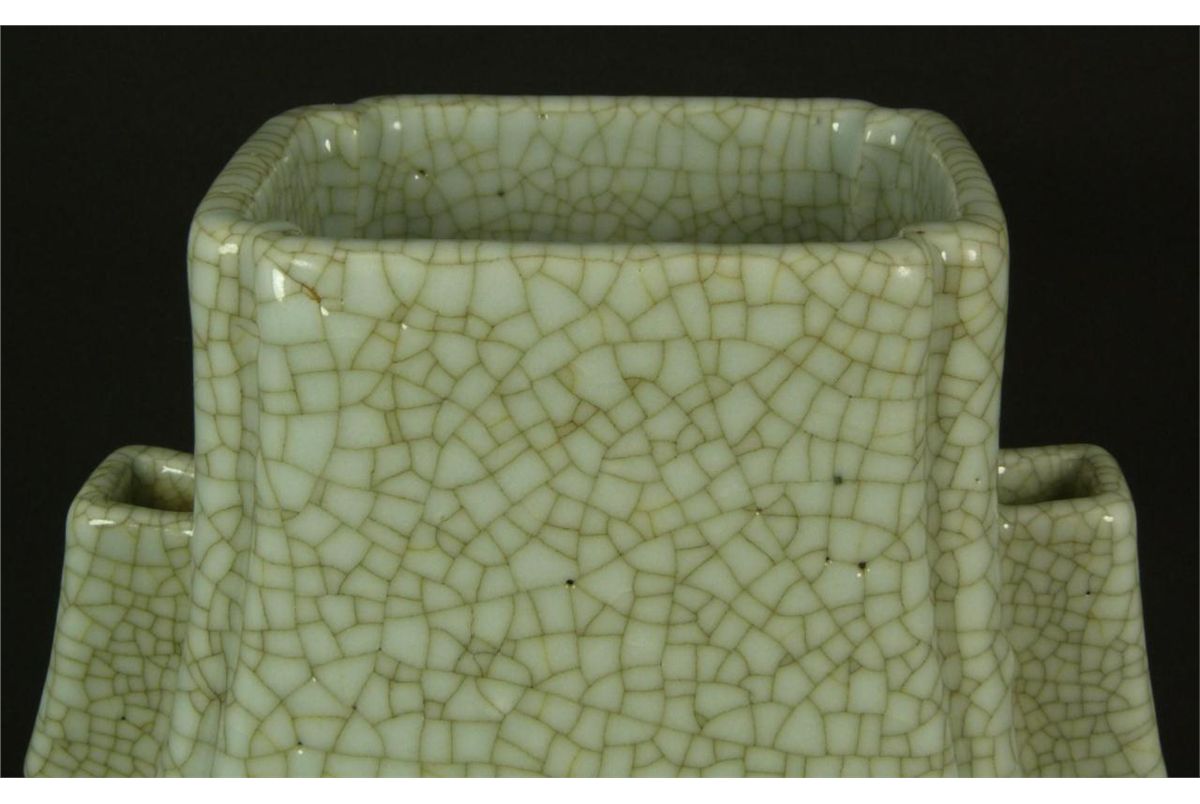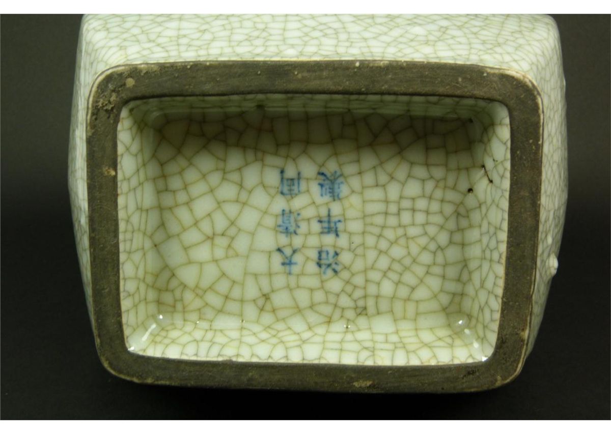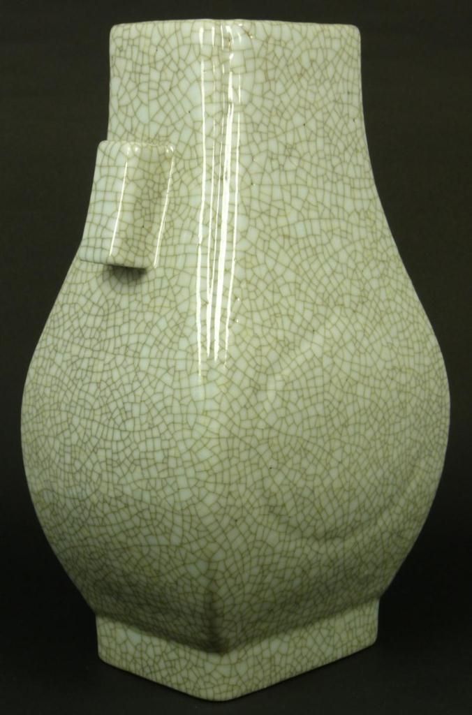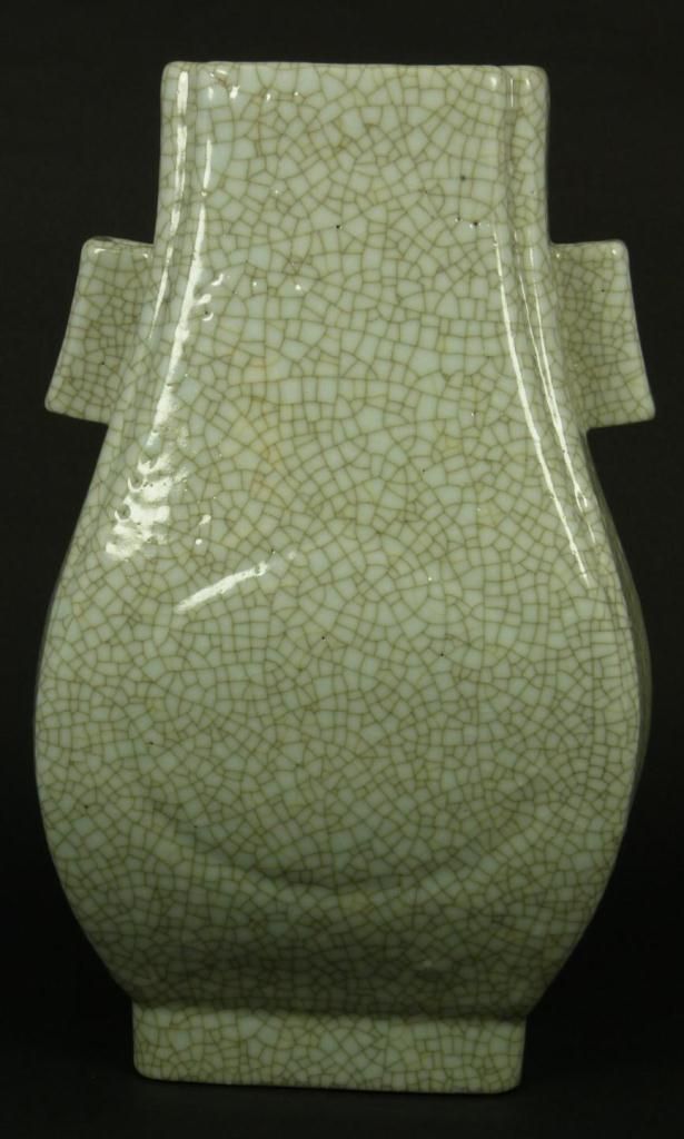 Antique Chinese crackle glaze celadon hu form vase. Having raised orbs to front and back. Bottom holds six character blue calligraphy Tongzhi (1862-1874) reign mark, and is of the period. Measures 12 1/8" height x 7 1/8" width (30.7cm x 18cm). Total weight of 3.48 kilograms.