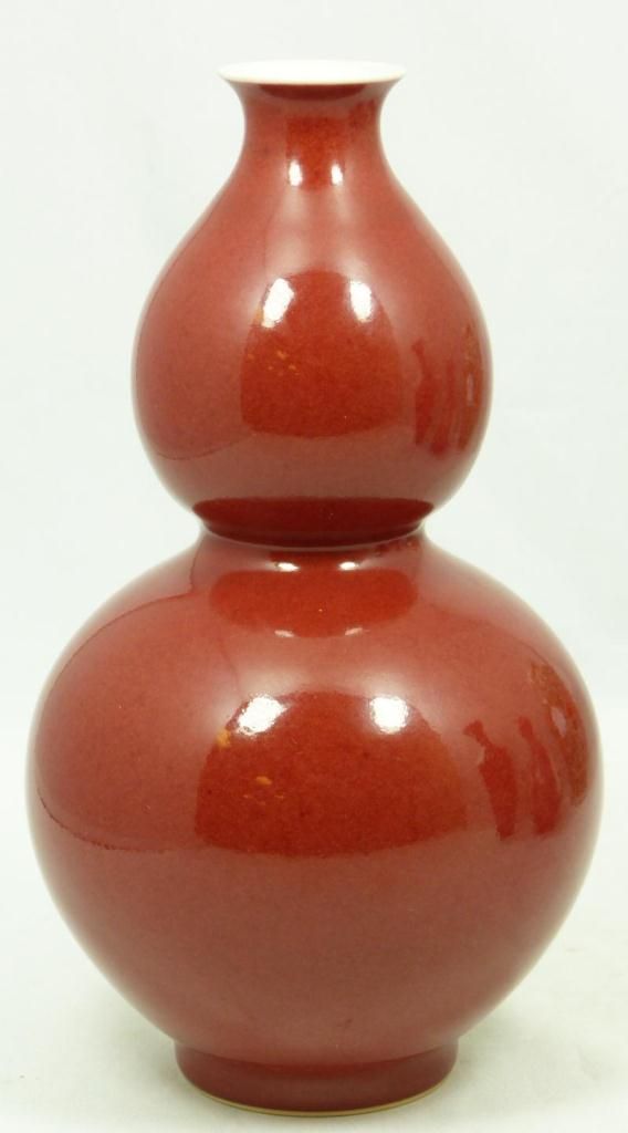 Antique Chinese sang de boeuf hulu form vase. Has white interior and blue bottom. Holds six character archaic Qianlong reign marks to bottom. Made late Qing dynasty. Measures 8 1/4" height x 5" diameter (20.9cm x 12.7cm). Total weight of 606 grams grams.