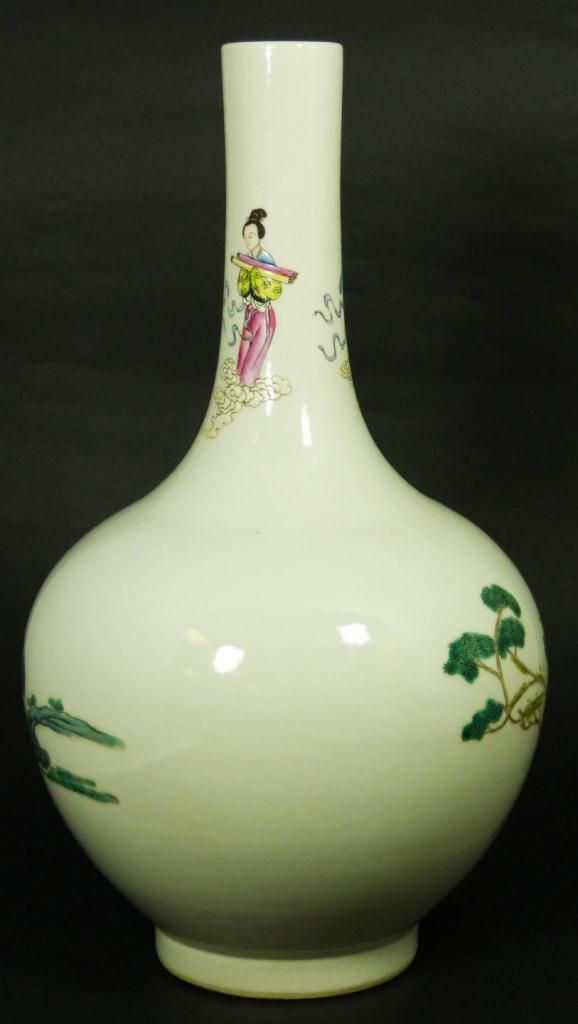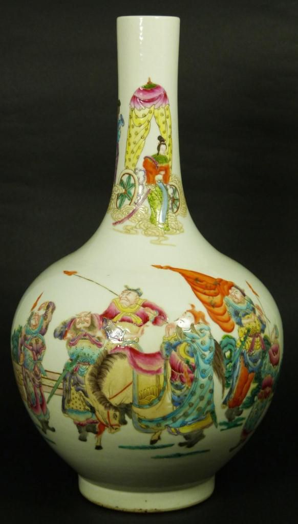 Antique Chinese hand painted enameled bottle form vase depicting 6 warriors in a courtyard scene with horse. Trees, fence and rock formations can aslo be seen. Neck has depictions of 3 maidens with clouds and carriage. Holds 6 character archaic red Qianlong (1736-1795). Measures 14 3/8" height (36.5cm). Total weight of 2182 grams.
