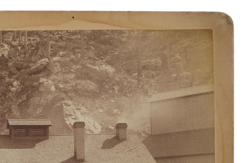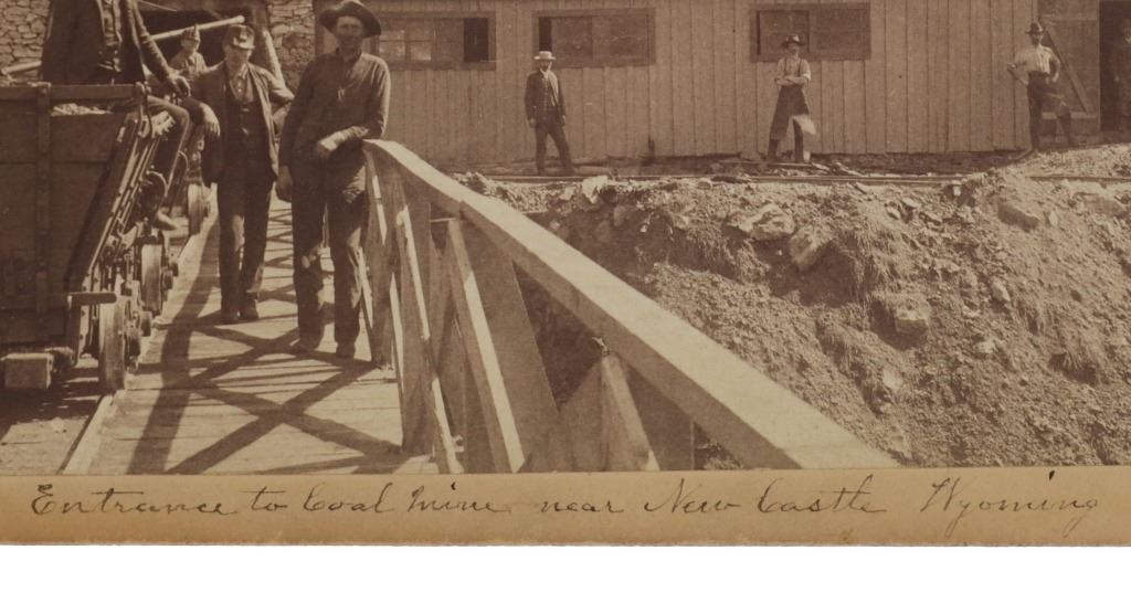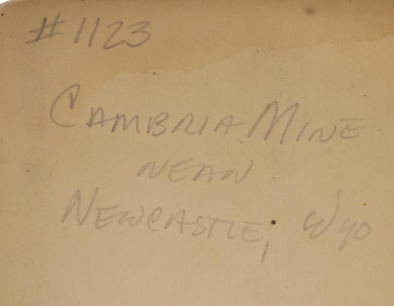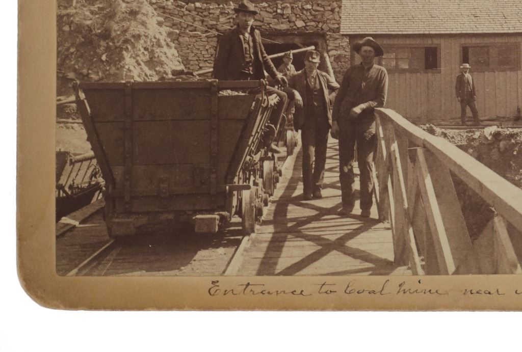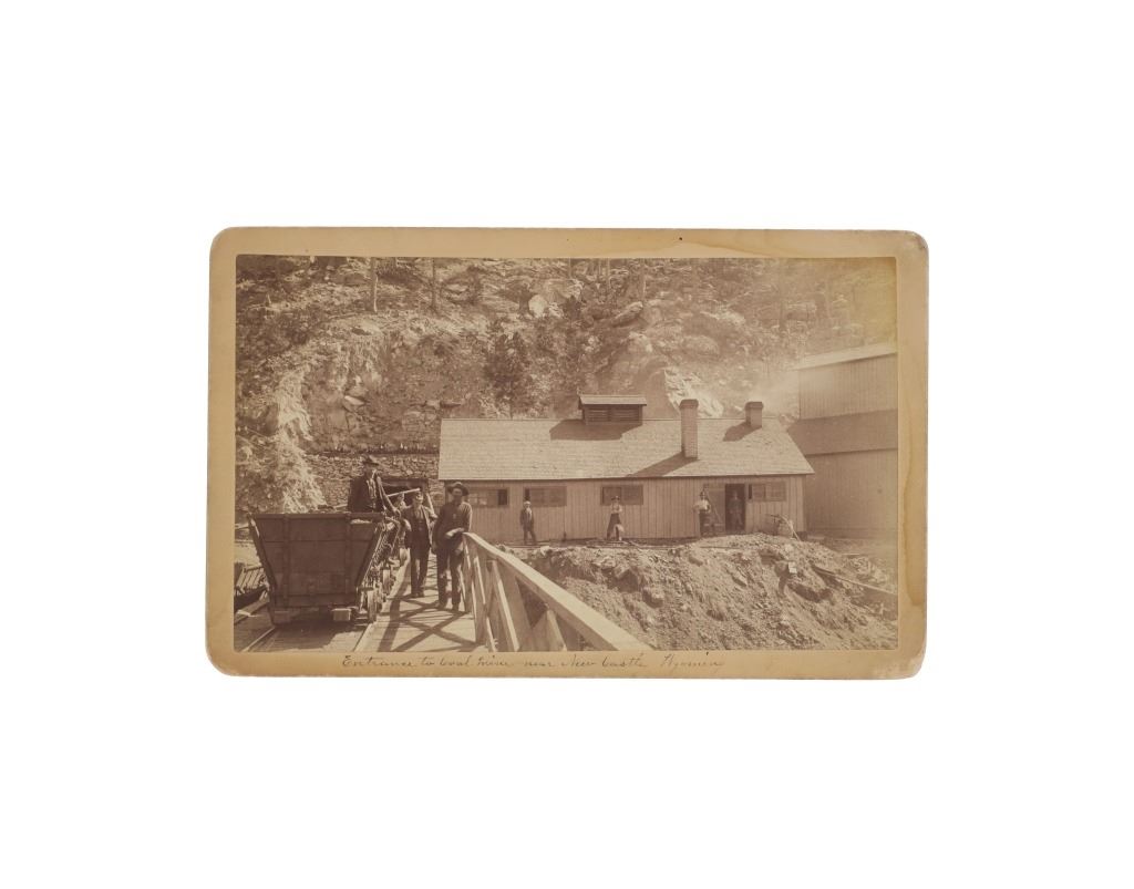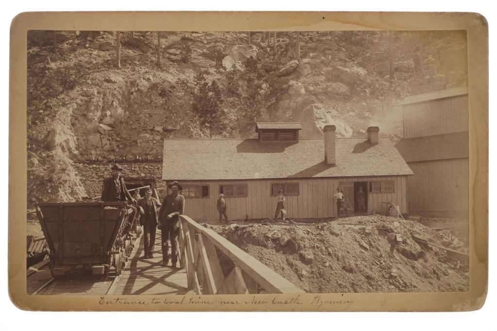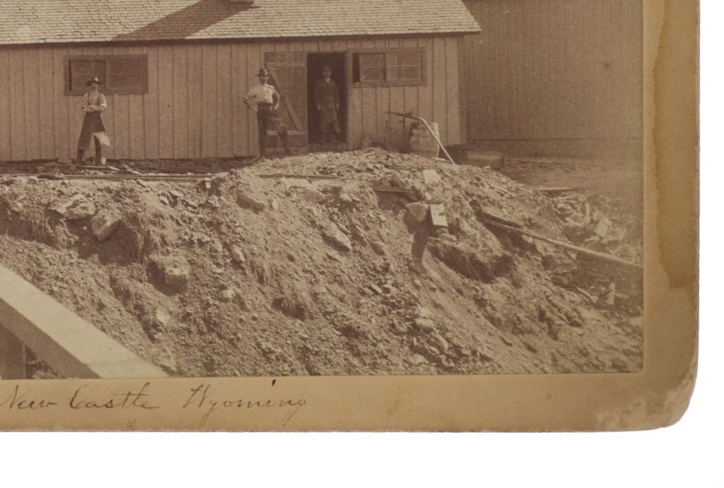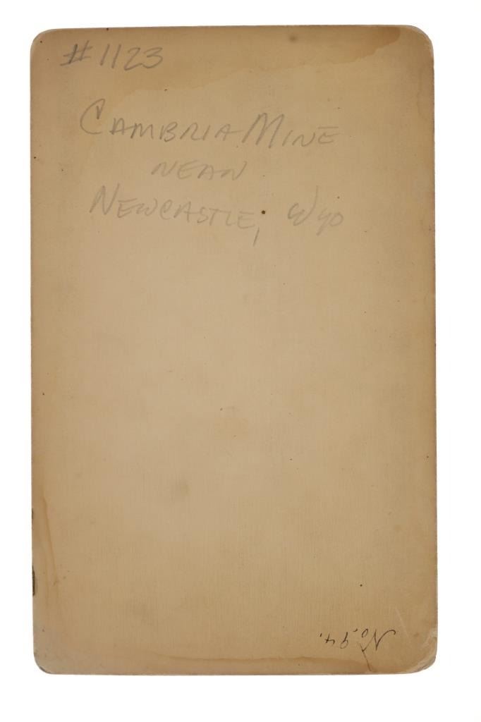This is an original photograph of Cambria Mine near Newcastle, Wyoming circa 19th Century, likely from Locke & Peterson of Deadwood, South Dakota. The photograph is marked in fountain ink, “Entrance to Coal mine near New Castle Wyoming”. The image shows wrought iron large mining carts with the mining camp and several Wyoming Mining Town men, showing the entrance to the mine. A very clear, beautiful image. The back is marked in pencil, “#1123 Cambria Mine near Newcastle, WYO.” As well as No. 94 in fountain ink. Several documented images dating to the 1890’s of the Cambria mine have come to the public market, all of which were from photographer Locke & Peterson of Deadwood, South Dakota. The Cambria mine was on the B. & M. R. R. (Burlington and Missouri Railroad) and a coal mining town. The operators of the mine were Kilpatrick Brothers & Collins. The deposits played out and the town was abandoned in the late 1920’s. Provenance: From the Jim Aplan Piedmont, South Dakota collection. Measures 8” by 5”. Good condition, clear image with some edge wear on the cabinet or boudoir card.
