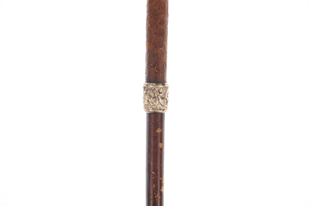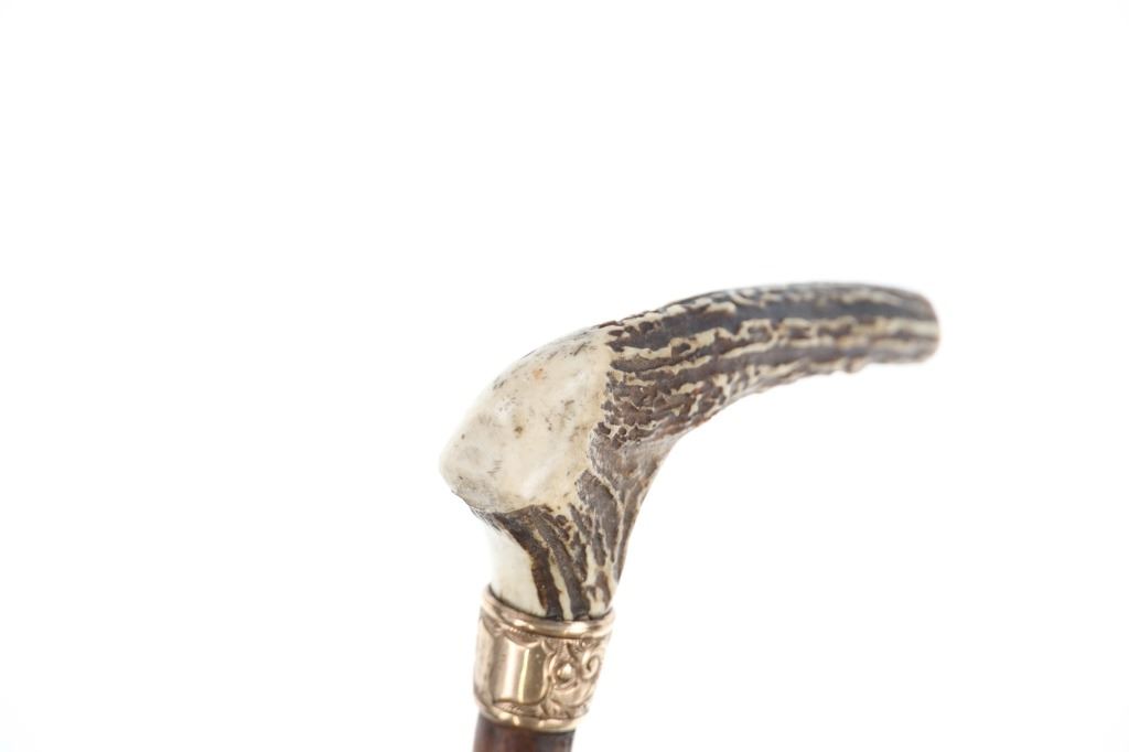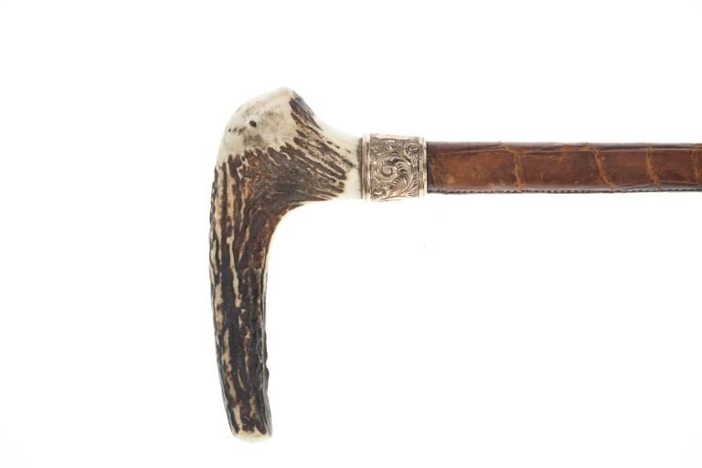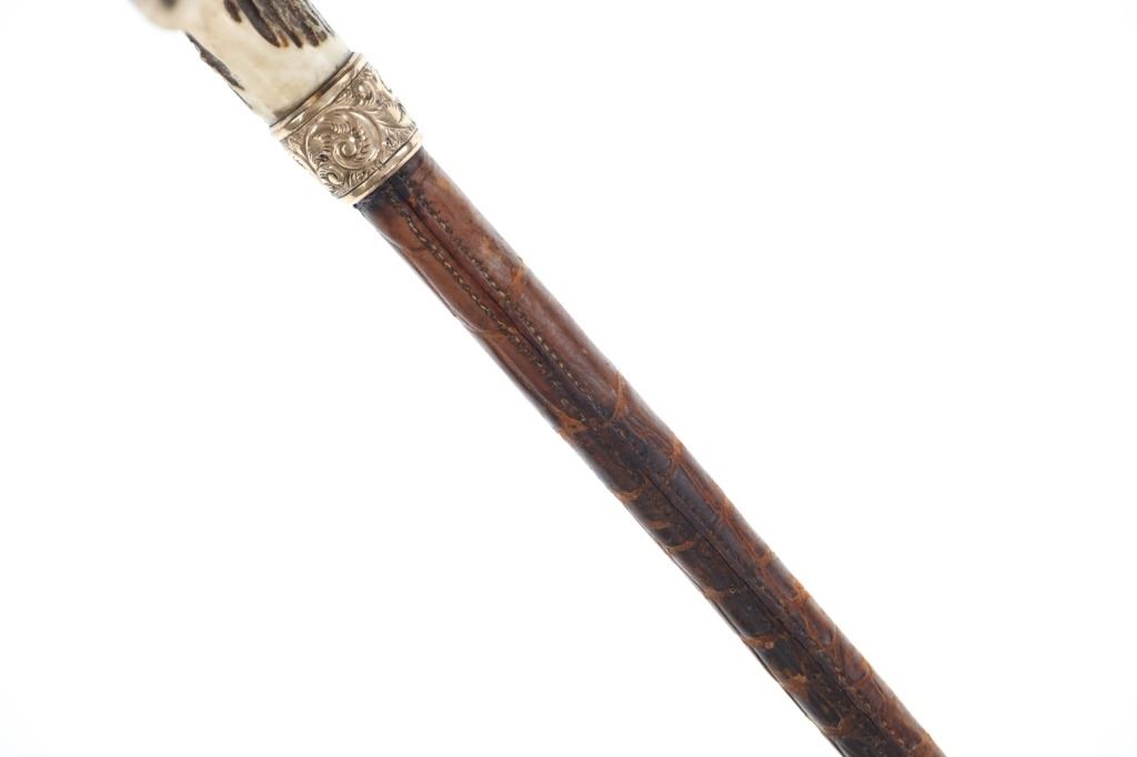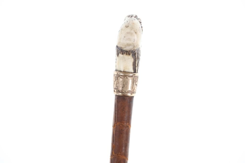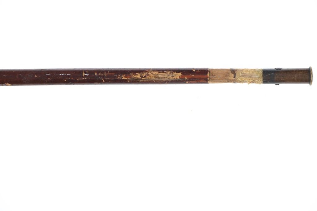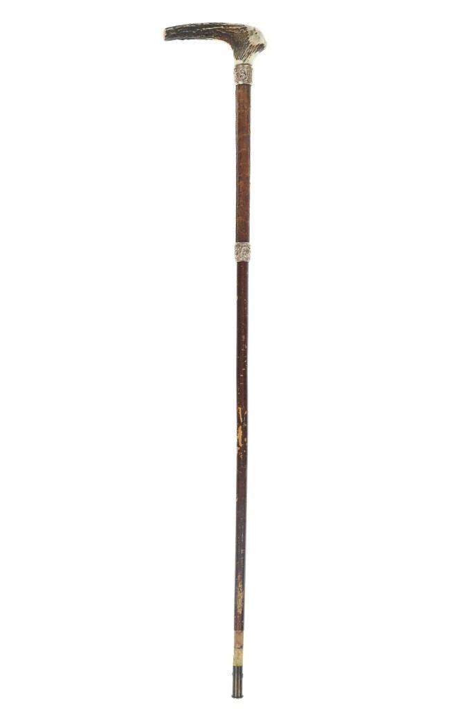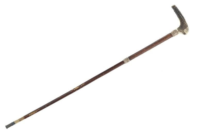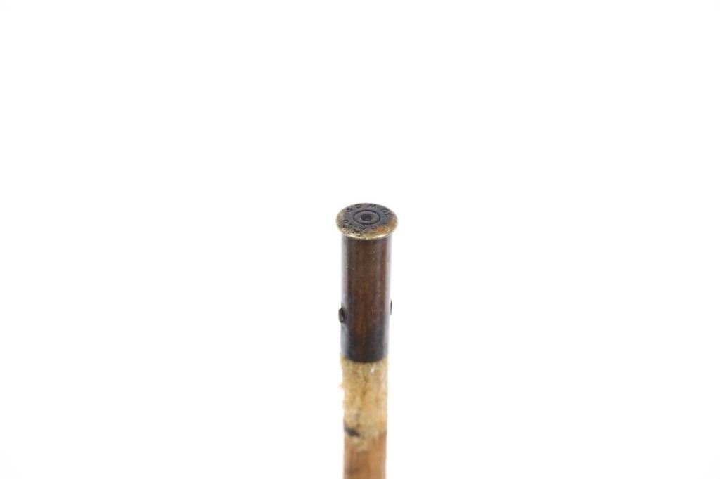 Featured in this lot is this cane leather wrapped and antler tine swagger stick circa 19th century. The swagger stick features a wonderfully and professionally crafted cane core and leather wrapped construction that brass ornate adornments and a antler tine handle. The tip of the swagger stick is capped with a .30 cal cartridge. The condition of this swagger stick is well preserved with some wear to the paint on the cane core and patina adorning the brass adornments but otherwise shows a well preserved overall condition. The measurements of this swagger stick is 26 1/4" x 4". The collective weight of this swagger stick is U4oz.