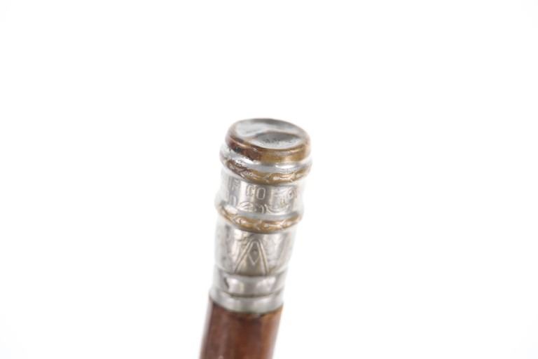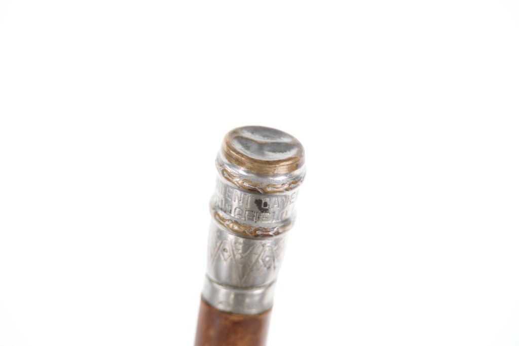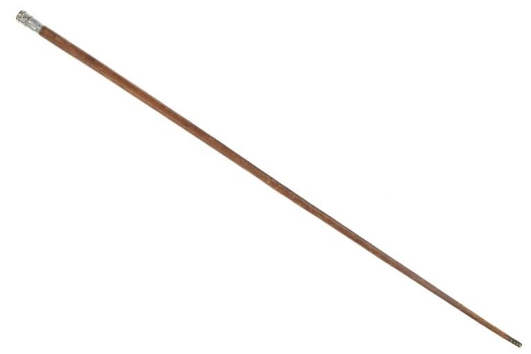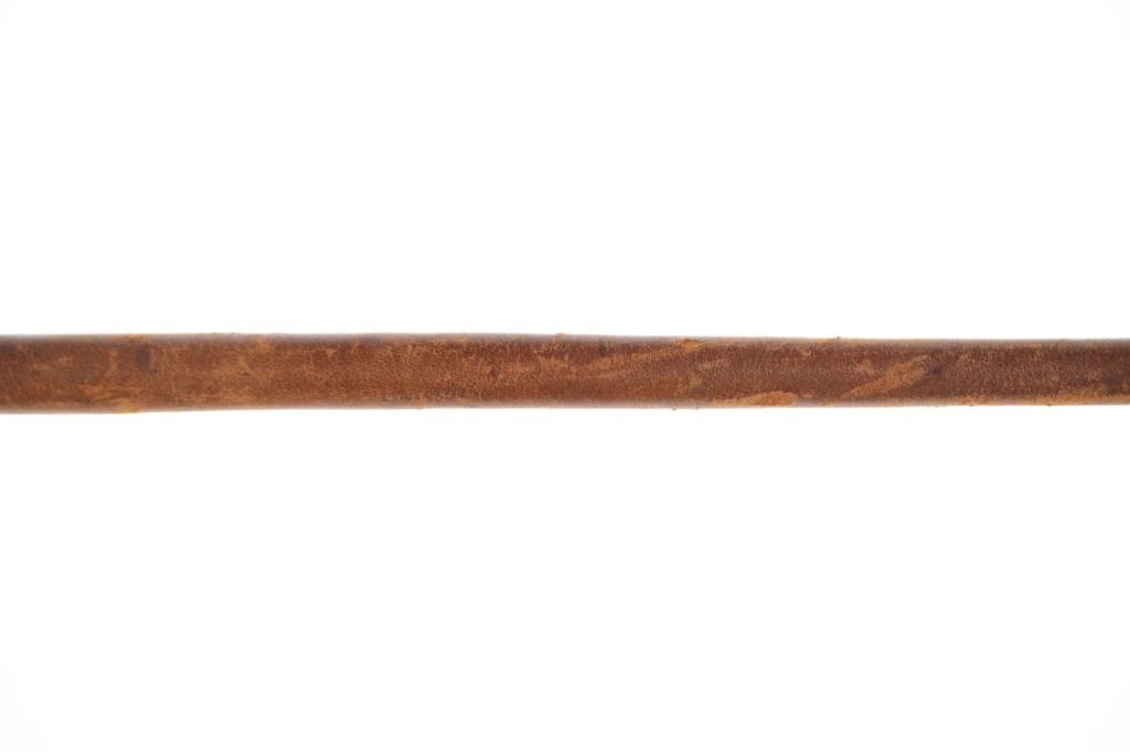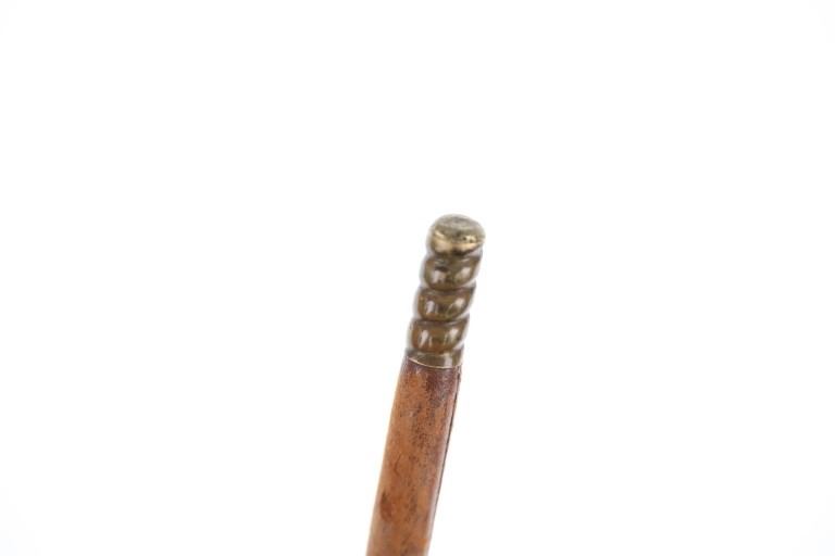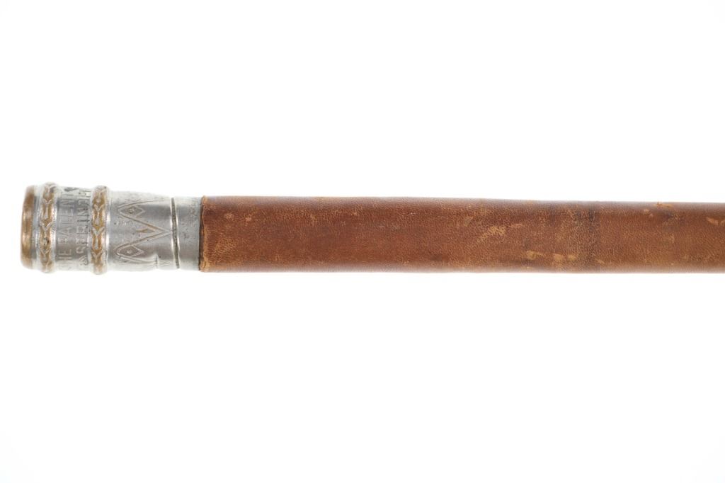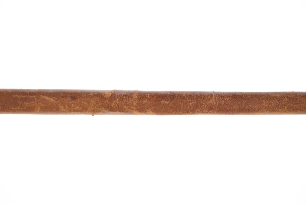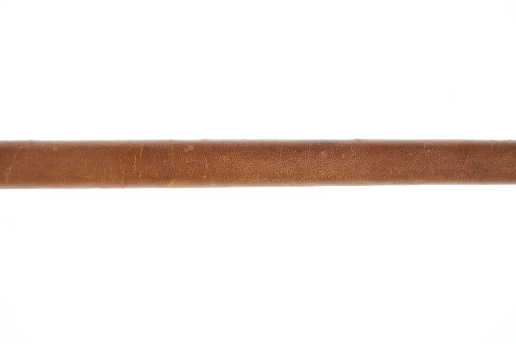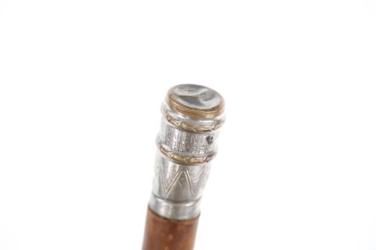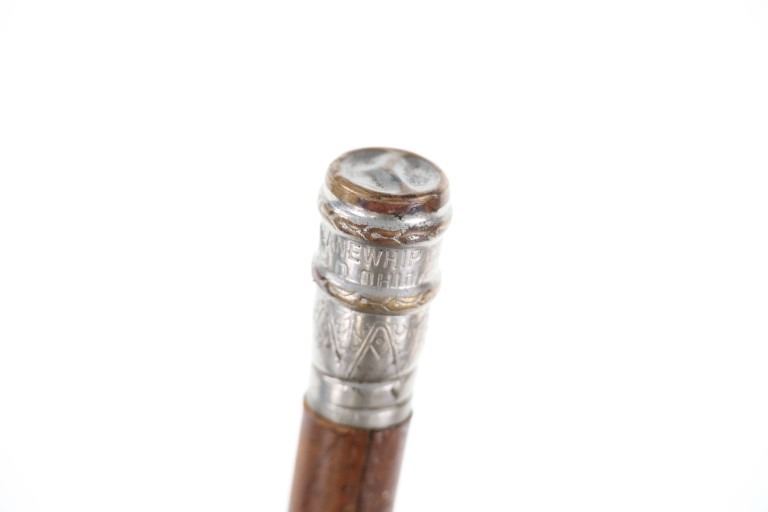 Featured in this Canewhip Co. Ohio buggy whip cane or walking stick patents circa 1891 & 1892. The buggy cane whip or walking stick features a wonderfully and professionally crafted cane core with stitched wrapped leather that shows inscribed metal head and tip of the cane. The canewhip is marked as follows:l Patent Canewhip Co. - Springfield, Ohio - Pat. Sep. 8, 91, Sep. 20, 92. The condition of this Canewhip Co. buggy whip is well preserved with some wear to the leather stitched wrapping of the cane stick and shows some patina adorning the head and tip of the canewhip but otherwise shows a well preserved condition. The measurements of this canewhip is 36 3/4" x 7/8" x 7/8". The collective weight of this canewhip is 4oz.