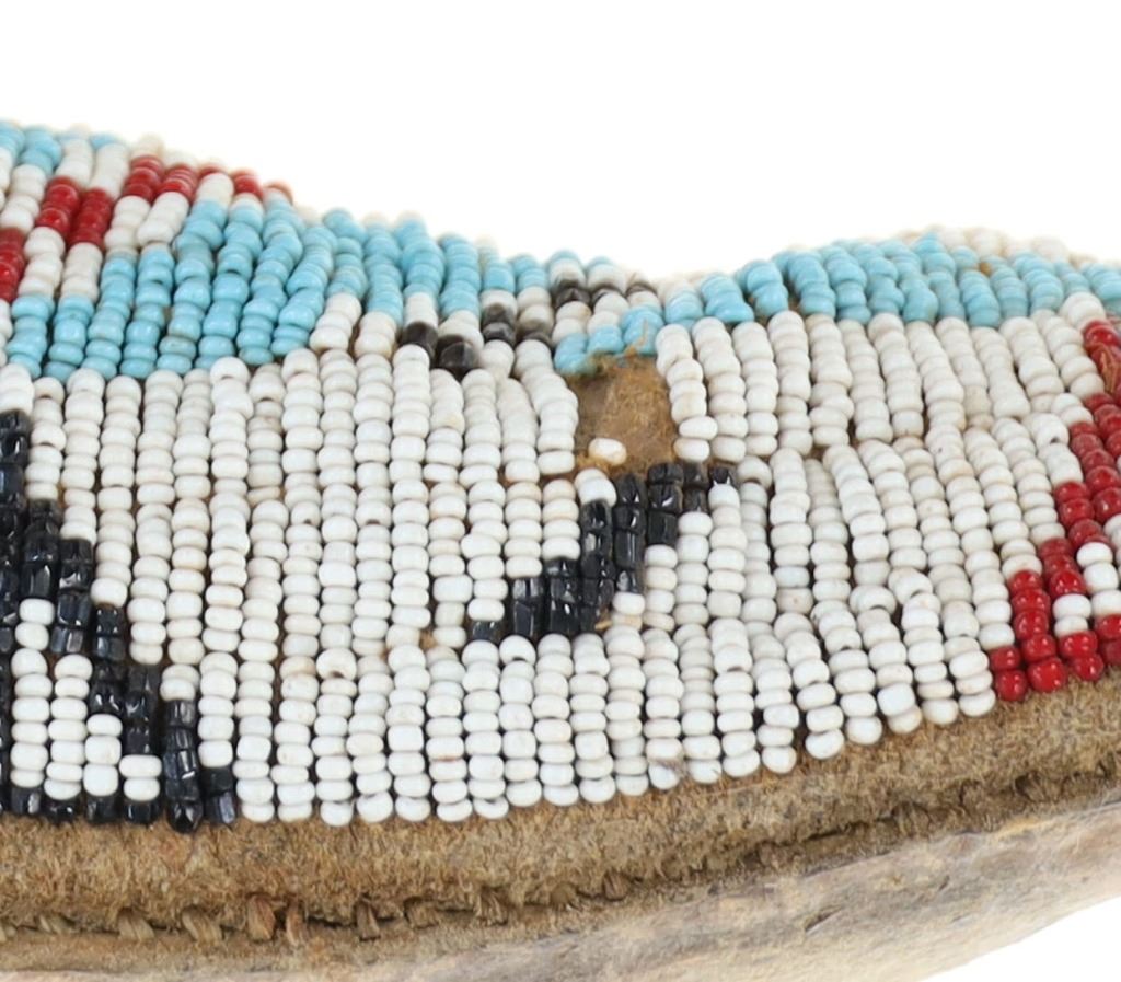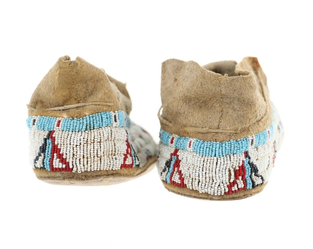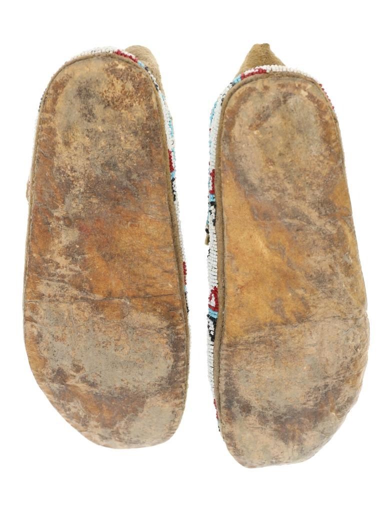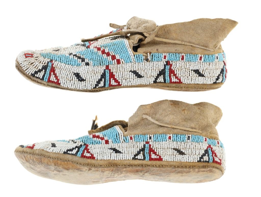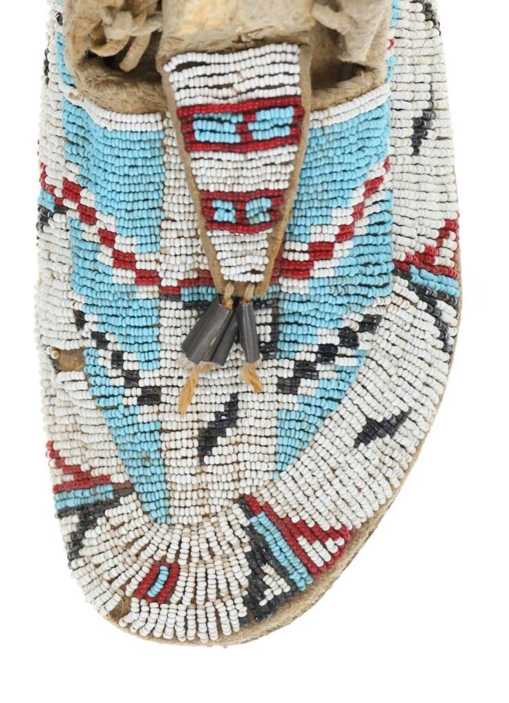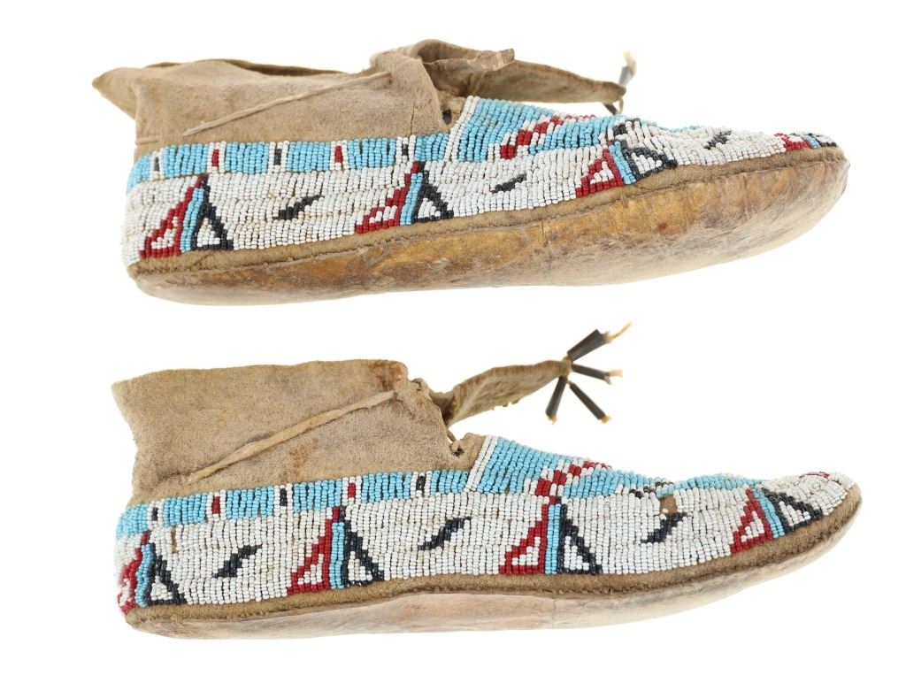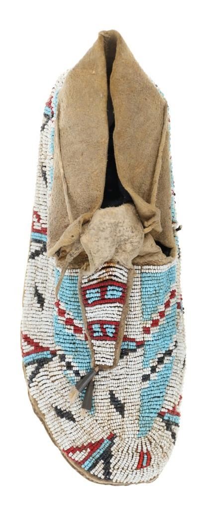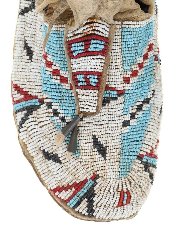 The lot features a wonderful set of 19th-century men's beaded Indian buffalo hide hard sole moccasins from the Cheyenne. The set is comprised of Indian tanned buffalo / bison thick hide sinew sewn with hard buffalo rawhide parfleche bottoms. The tops and tongue are covered in classic Cheyenne geometric beadwork. The sinew sewn beadwork shows colors of chalk white, light blue, semi-transparent red, red white heart, and faceted black, all early glass trade seed beads. The tongue has a unique pattern of drop like tapering triangle design, covered in a tab like beadwork design and having yarn fringes with rolled tin metal jingle dangle cones on the end. The Indian hide ties are still presetn and the set is well preserved with msotly supple tops, no major damages or cracks and very little bead loss. The nice sinew threads can be clearly seen, an early beadwork attribute. The men's moccasins each measure 11-inches long by 4.25-inches wide by 4-inches high at the ankle.