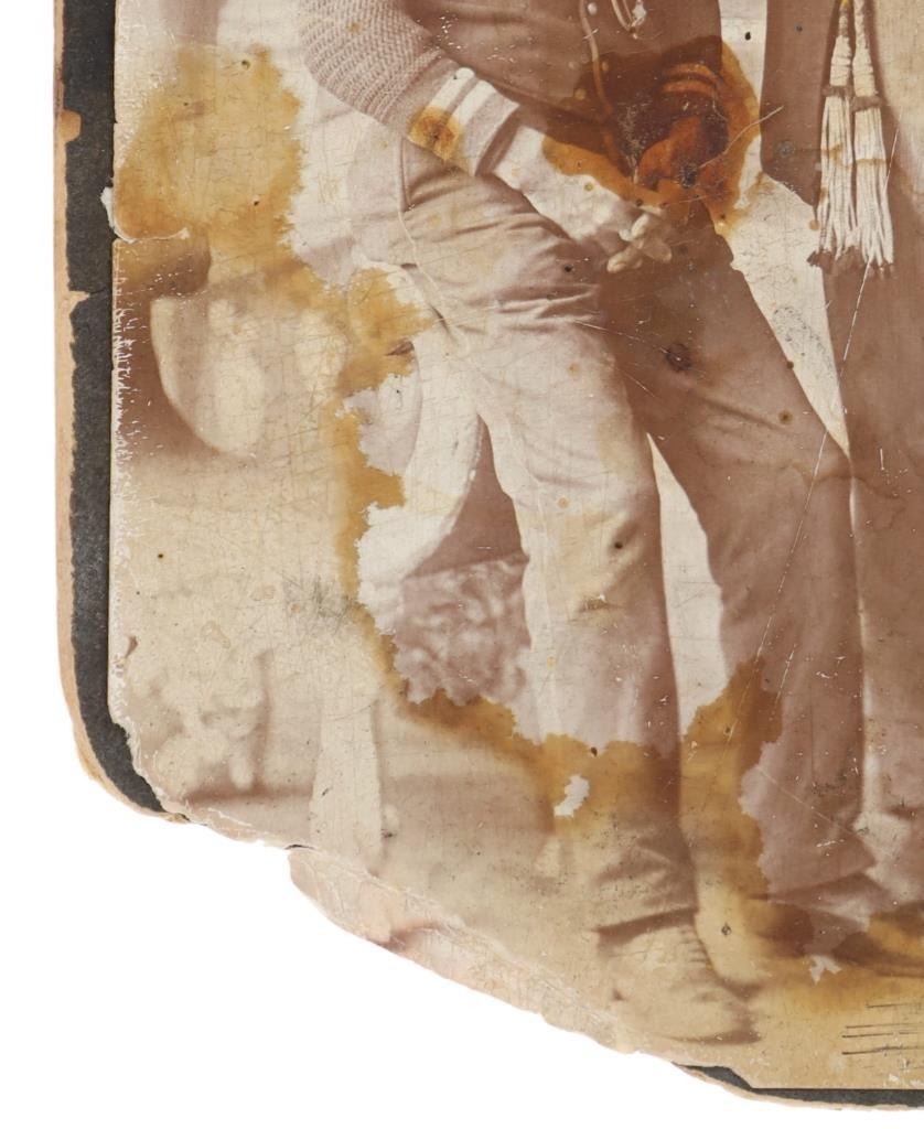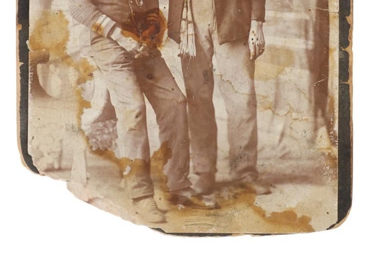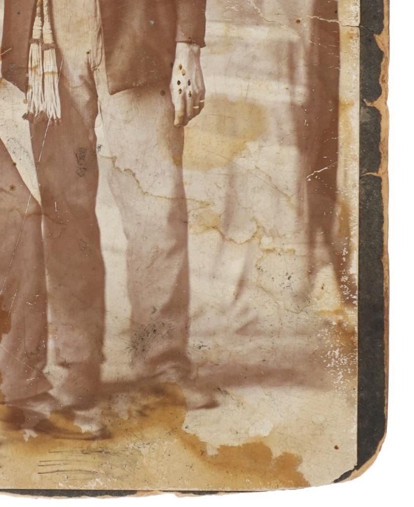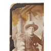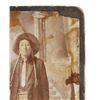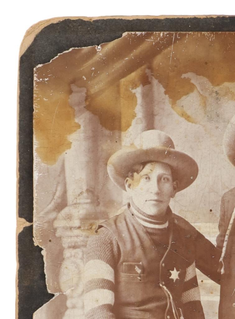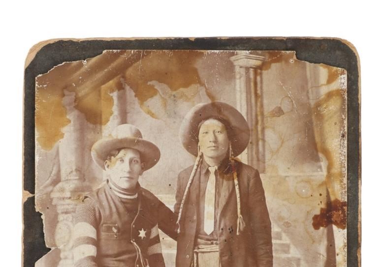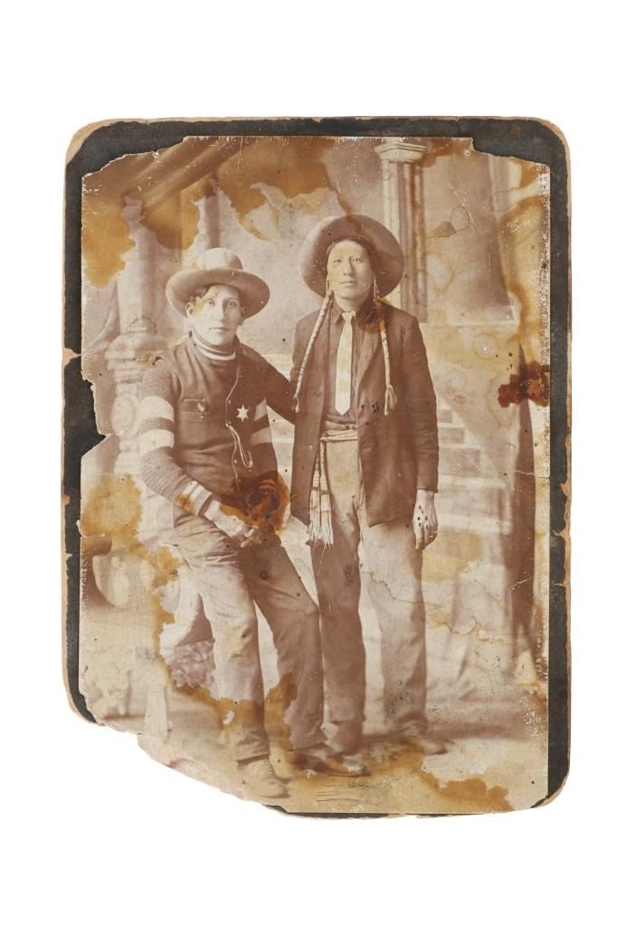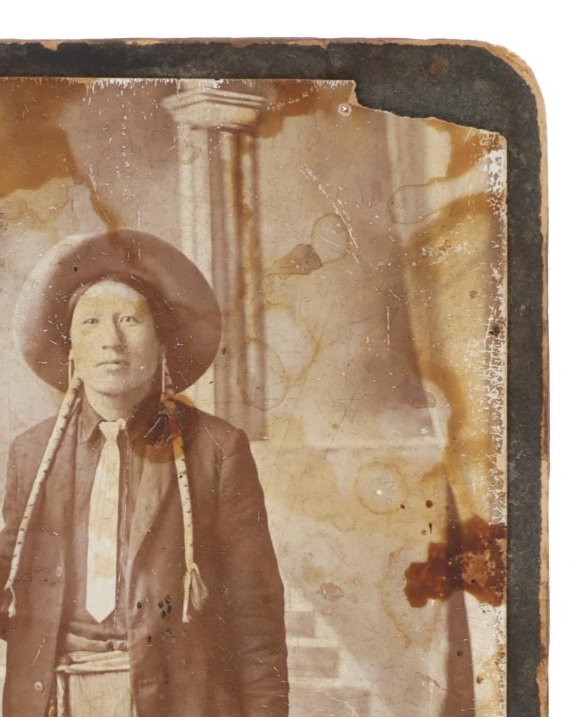 This is an original late 19th Century photograph cabinet card of two Cheyenne Indian Police members in cowboy hats from Oklahoma. The original photograph shows two Cheyenne men in cowboy hats and one having an Indian Police Badge and pocket watch chain on his old sweater. There is another photograph noted as, "Dakon and Fletcher in El Reno, Oklahoma Territory - Southern Cheyenne Shiffers Pictures". This piece has some edge damage, one folded broken edge, some staining, but all of this adds to the amazing look of the piece. From the Jim Aplan Piedmont, South Dakota collection. Measures 5.75" by 4.25".